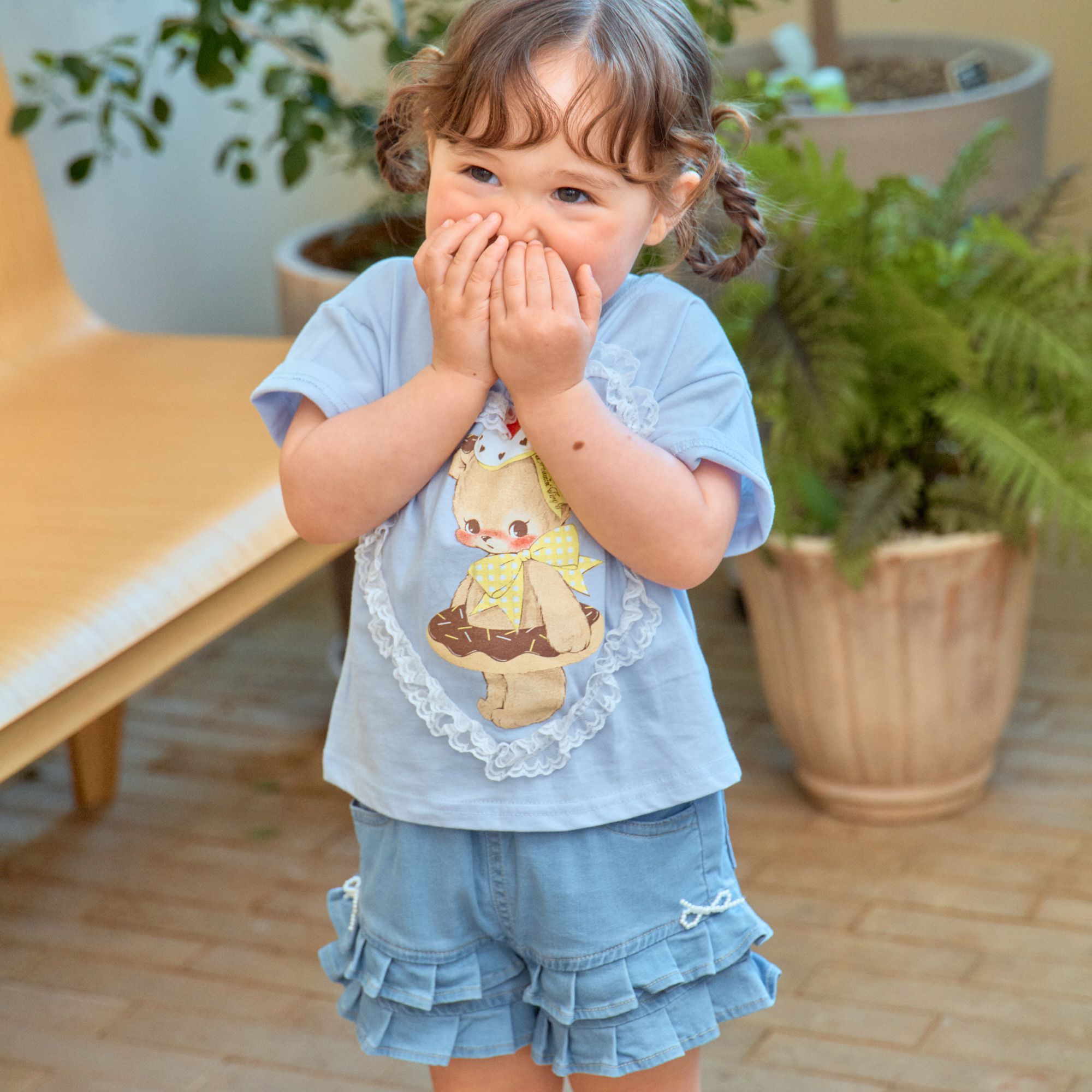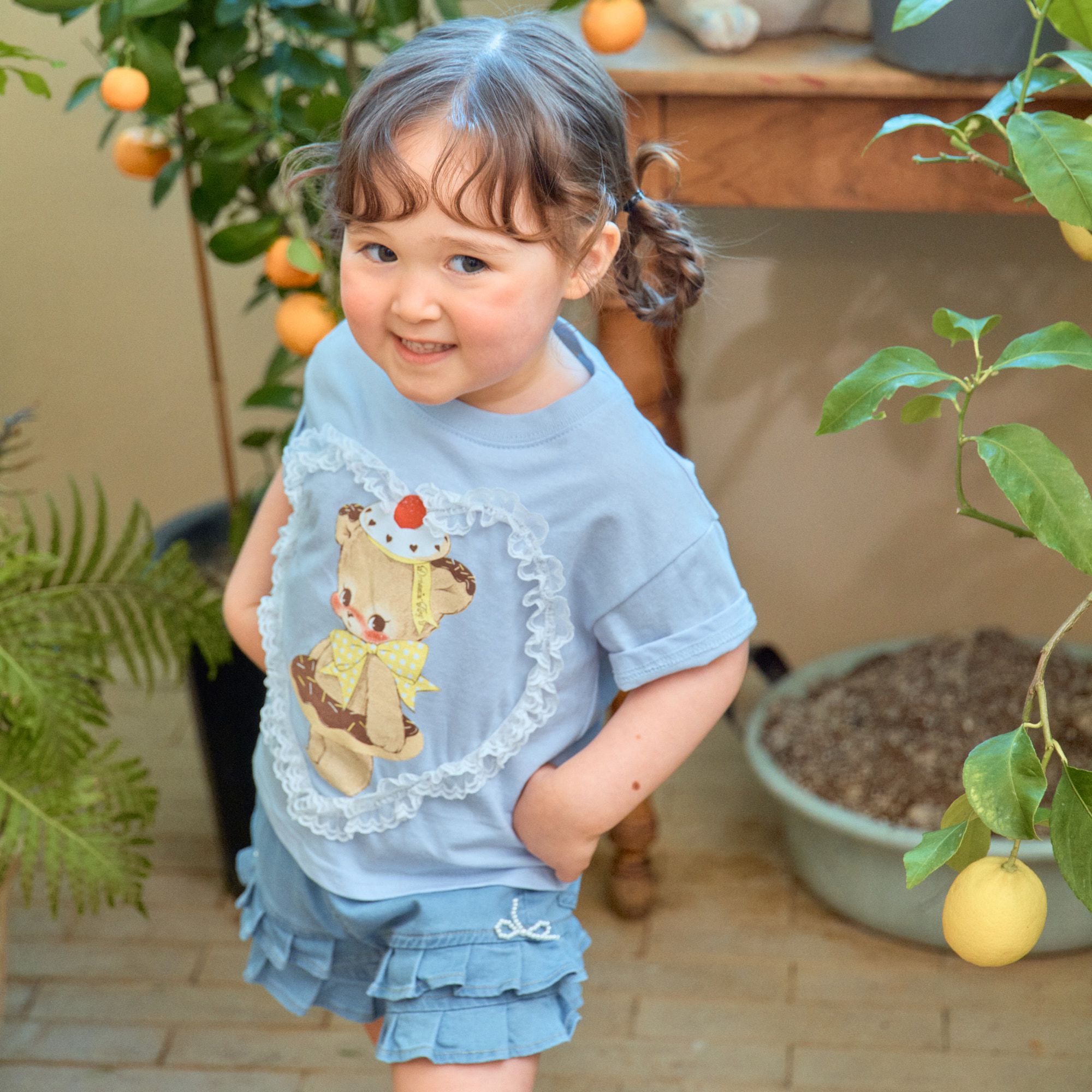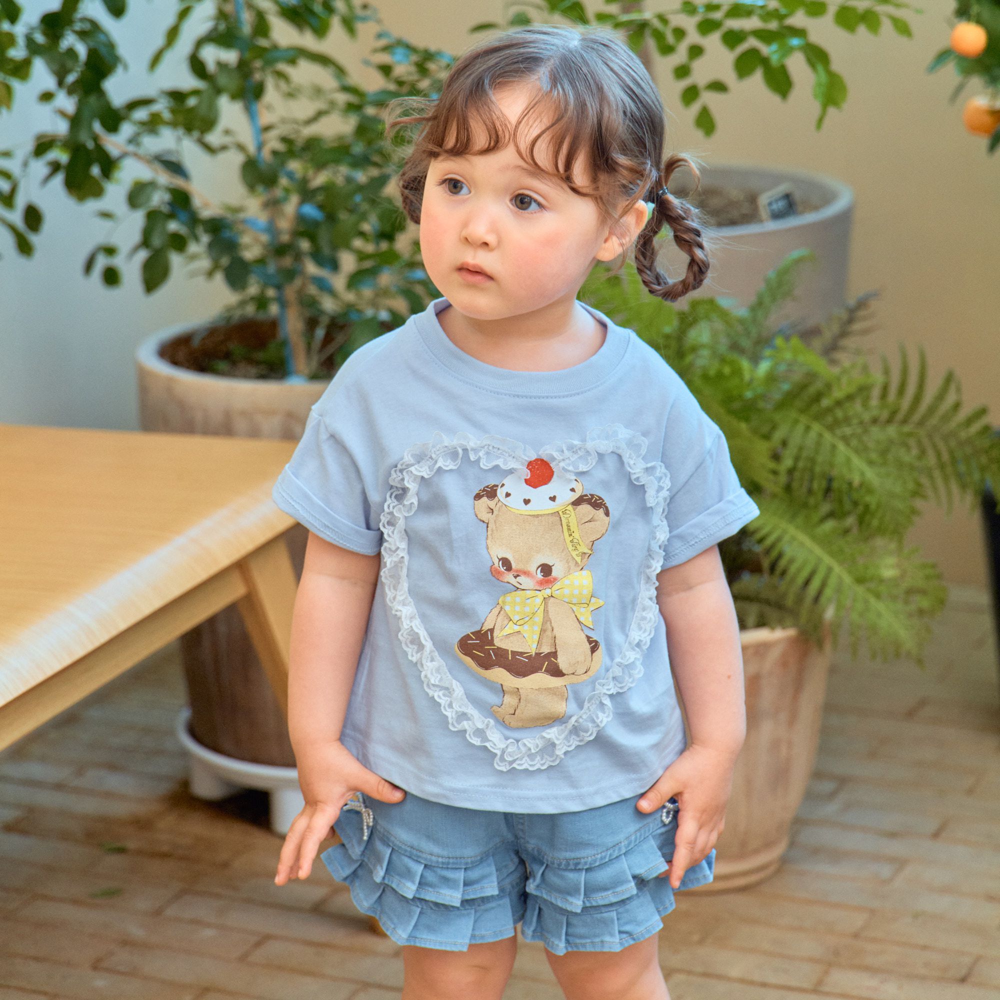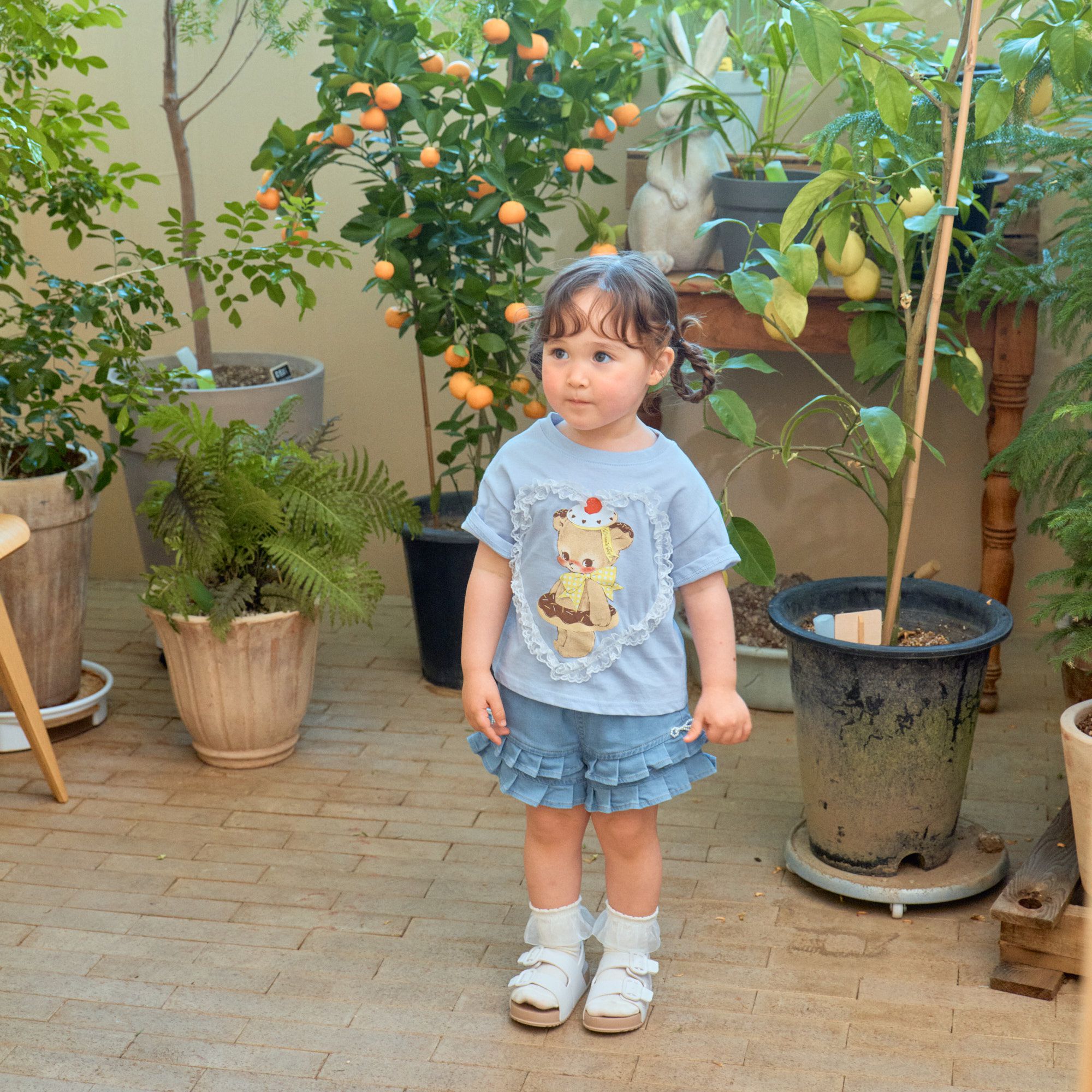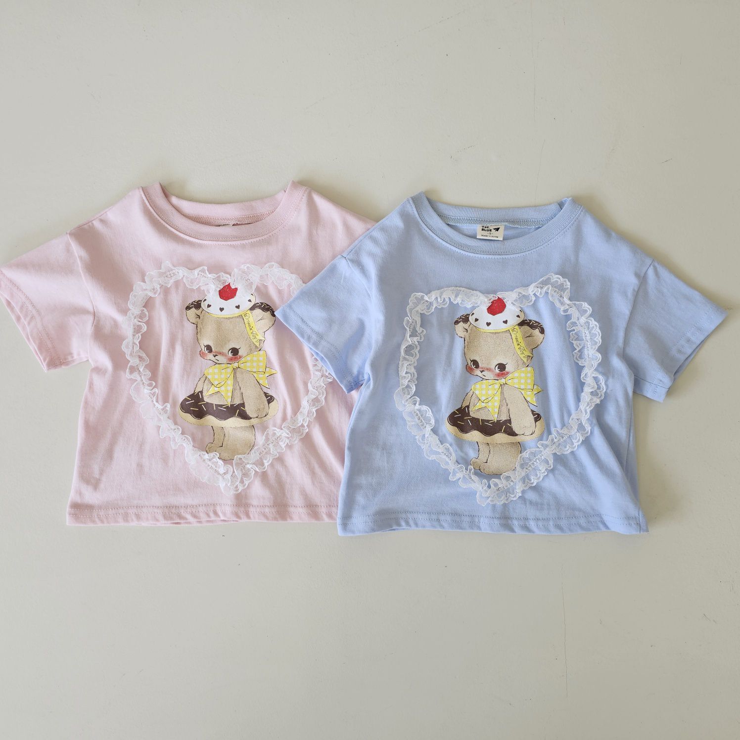 韓國 First Blue - 甜點熊蕾絲愛心裝飾短袖上衣-淺藍
