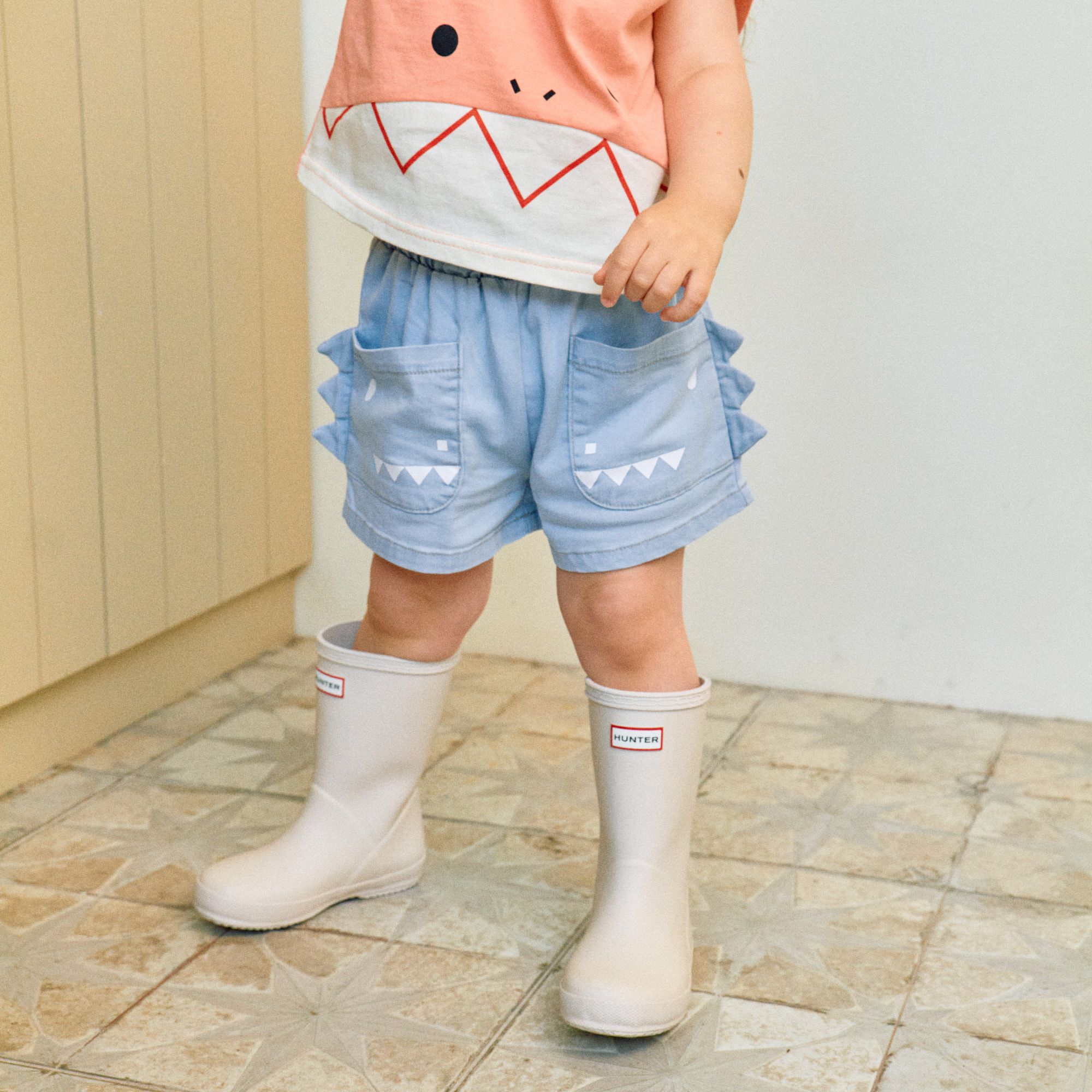 韓國 First Blue - (涼感材質)鬆緊腰角角裝飾口袋短褲-淺藍