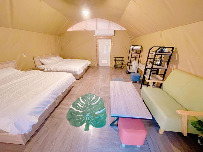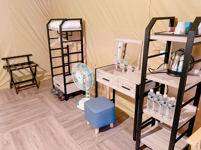 在營帳內也附有冷氣、除濕機及電風扇,充電插座也充足,住宿環境非常舒適呢!