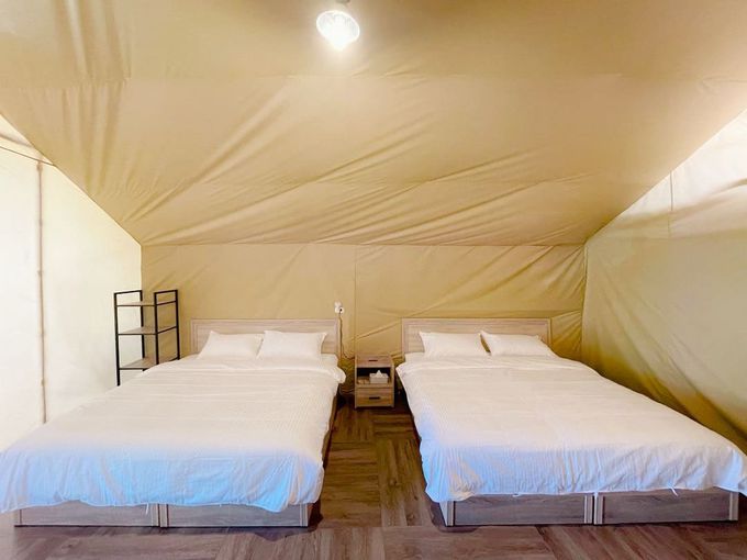 一踏入奢花帳篷的主臥區,木質調的設計跟外面的風景完美搭配,白天不用開燈,陽光便穿越帳篷撒入帳內,整體風格簡單而溫馨