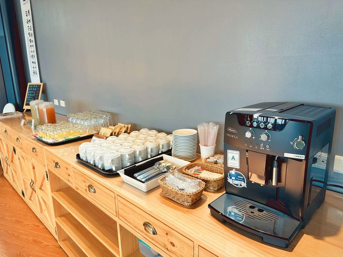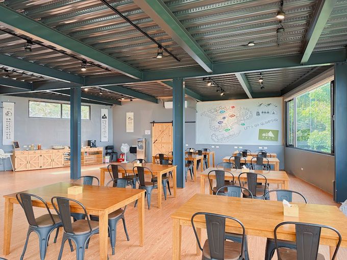 餐廳與報到處在同一個空間,寬敞的餐廳內有整面窗景,向外望去翠綠的樹木與遠處的山巒層層堆疊而起,在裡面享用美味的食物,覺得胃像遼闊的山景一樣大開了XD