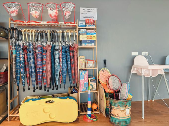 餐廳的另一側有借用區及販售區,在這裡可以借雨傘、桌遊、戶外遊戲用品及防蚊液,還有周邊景點的DM可供參考,打卡還送野趣小提袋喲!