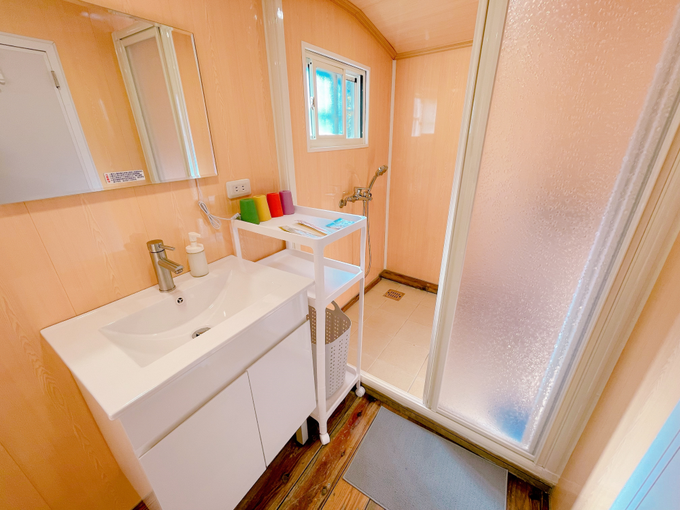 往內帳走進是盥洗區,營區也響應環境部減少一次性用品使用的政策,所以帳內沒有牙刷組、浴帽及梳子等備品,出門前記得要把牙刷、牙膏等盥洗用品帶上呦!