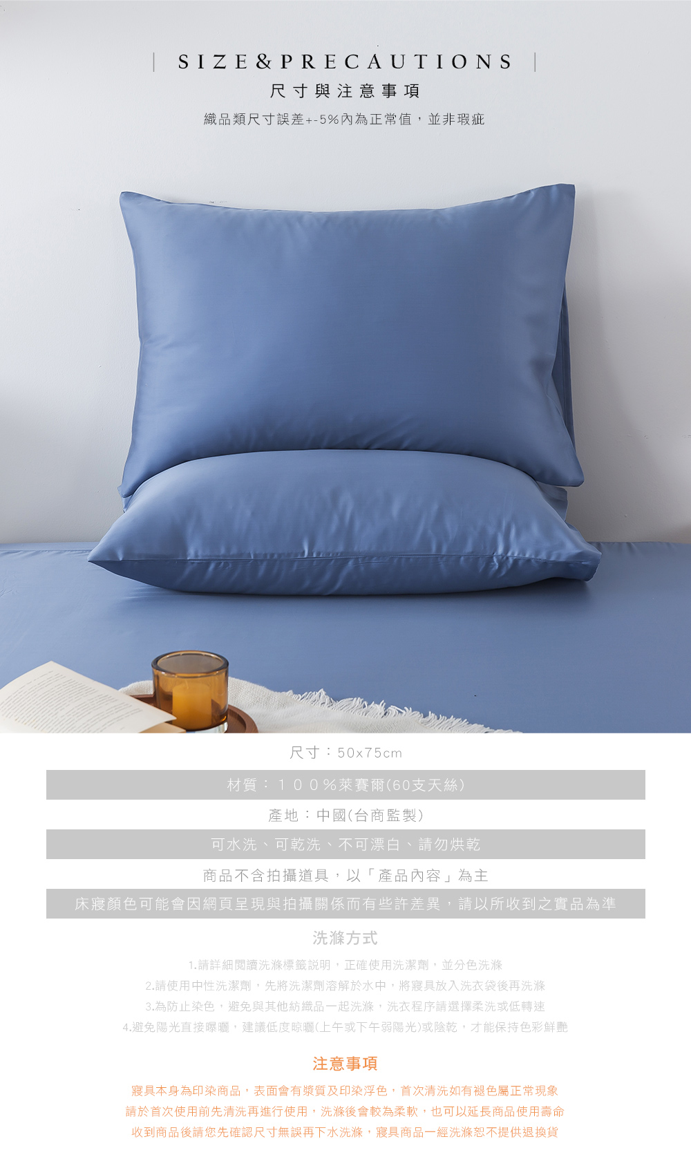 ◆產品內容:◎內容:60支天絲枕套二入(此賣場僅販售枕套,不含床包被套)◎材質:100%萊賽爾(60支天絲)◎尺寸:50x75cm(+-5%)◎產地:中國(台商監製)◆注意事項:◎清潔保養方式:可水洗、可乾洗、不可漂白、不可烘乾◎建議清洗時,先將洗劑溶解於水中,再將床寢放入大型洗衣袋後再清洗◎本商品不含拍攝道具,以「產品內容」為主◆產品顏色可能會因網頁呈現與拍攝關係而有些許差異,請以所收到之實品為準。