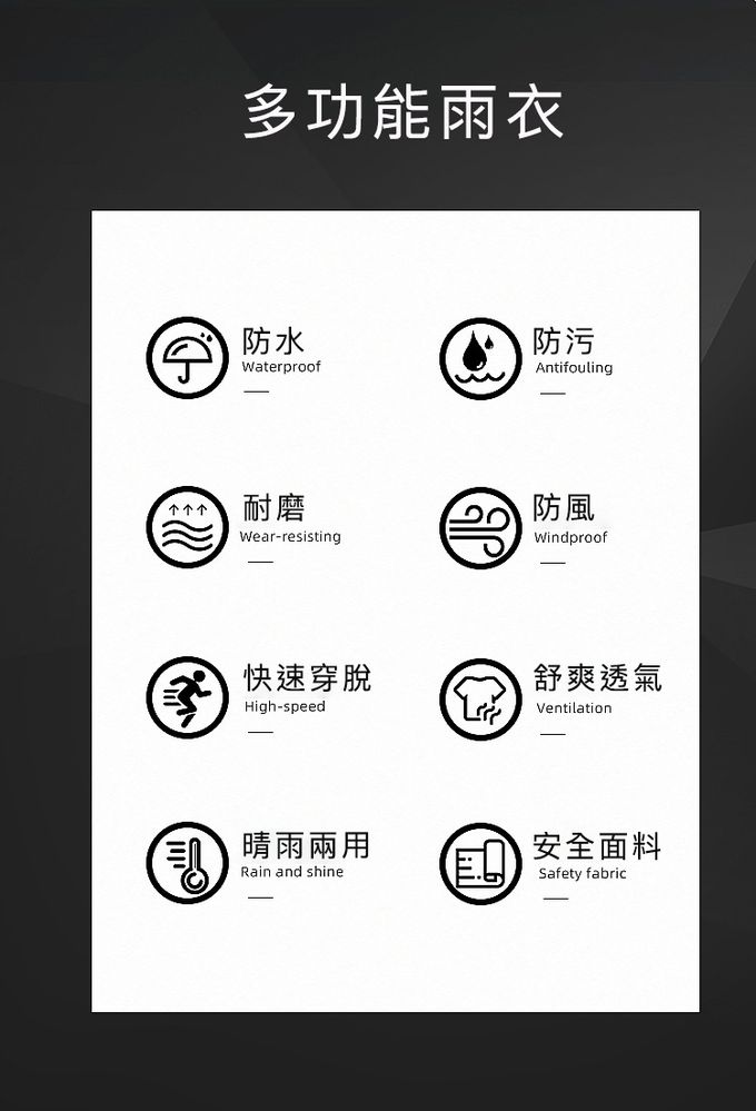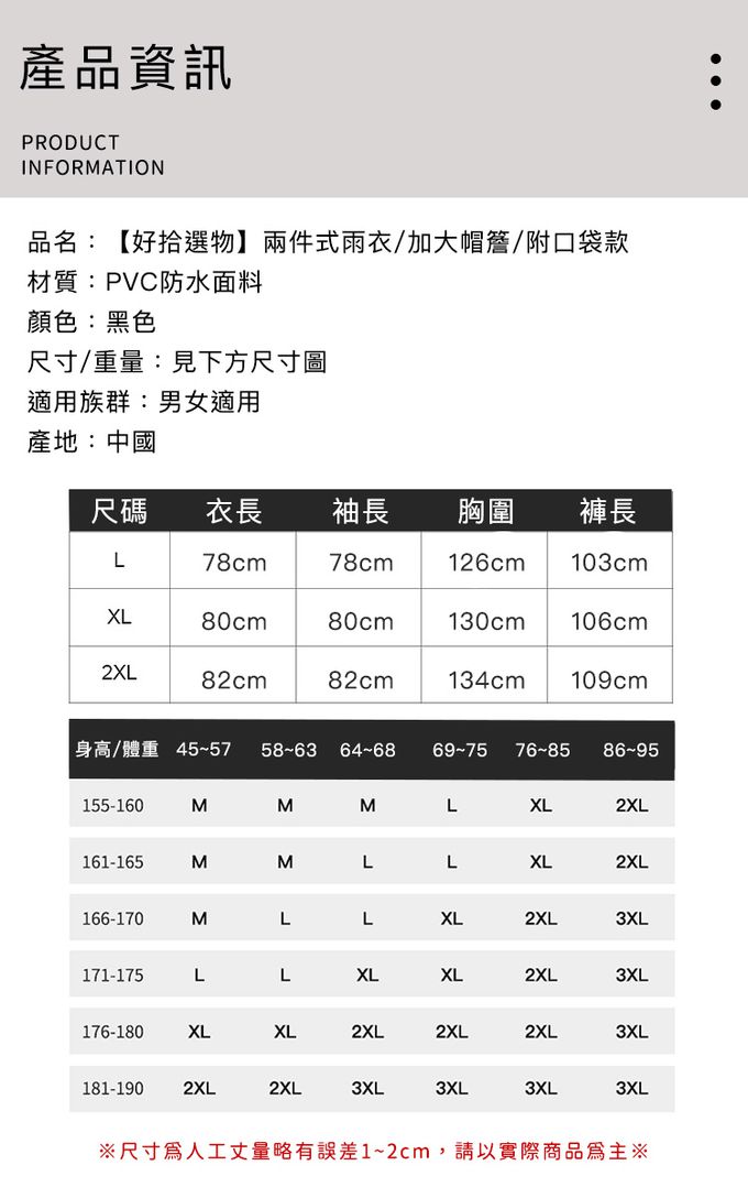 注意事項:1.商品到貨享鑑賞期之權益,鑑賞期並非試用期,辦理退貨商品必須是全新狀態且紙箱及商品配件包裝須完整。商品一經使用或組裝後,恕無法辦理退換貨。 2.商品為人工丈量略有1~3公分內誤差,請以實品為主。 3.網頁商品會因面板螢幕解析度不同,造成圖片顏色呈現略有不同,請以實品顏色為準。 4.商品圖為情境示意圖,本商品內容不包含擺飾物品。 5.請勿直接機洗,造成商品損壞。 6.雨衣為消耗類的產品,防撥水效能會因為使用頻率逐漸減弱為正常現象。 7.穿著時請注意"扣合位置平整服貼",避免積水而造成雨水內滲。 8.領口及袖口請調整到適當空間,避免因空隙過大造成滲水。 9.正確佩戴帽子可避免雨水從領口滲入。 10.建議口袋內請勿放置3C產品或無防水功能等用品。 11.使用後請放置通風處自然陰乾,確認完全乾燥後方能收納,避免發霉或損耗防撥水機能。