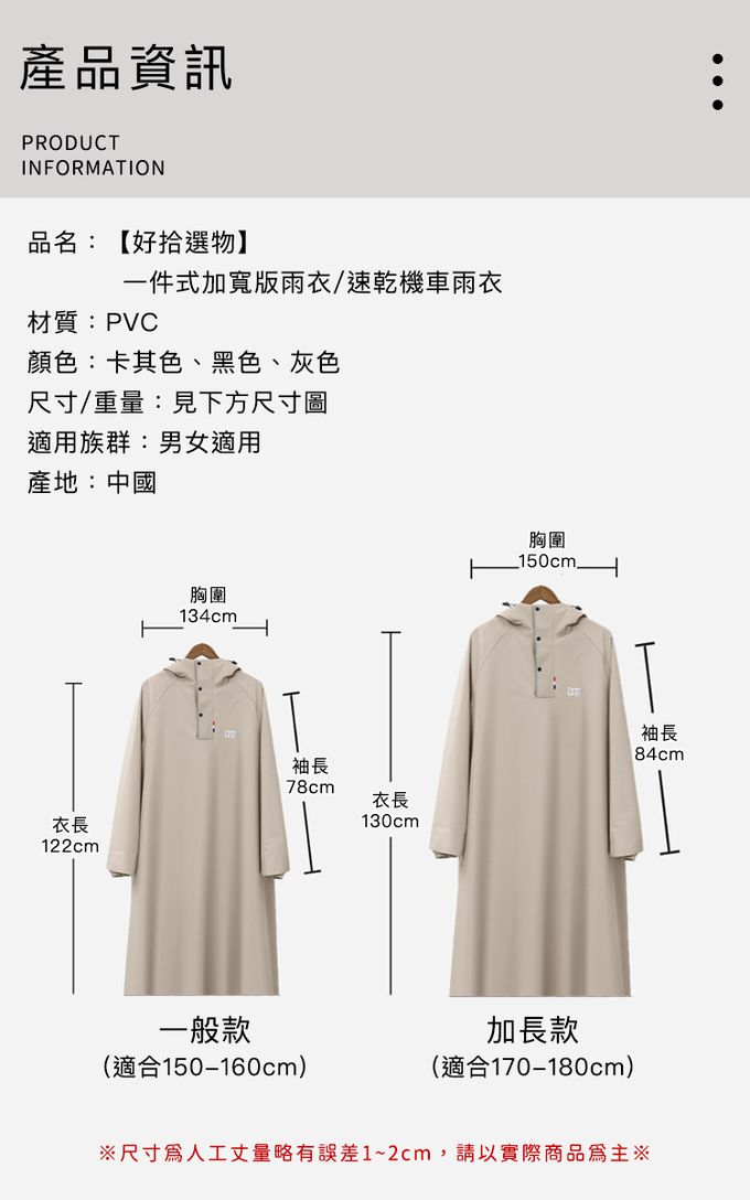 注意事項:1.商品到貨享鑑賞期之權益,鑑賞期並非試用期,辦理退貨商品必須是全新狀態且紙箱及商品配件包裝須完整。商品一經使用或組裝後,恕無法辦理退換貨。 2.商品為人工丈量略有1~3公分內誤差,請以實品為主。 3.網頁商品會因面板螢幕解析度不同,造成圖片顏色呈現略有不同,請以實品顏色為準。 4.商品圖為情境示意圖,本商品內容不包含擺飾物品。 5.請勿直接機洗,造成商品損壞。 6.雨衣為消耗類的產品,防撥水效能會因為使用頻率逐漸減弱為正常現象。 7.穿著時請注意"扣合位置平整服貼",避免積水而造成雨水內滲。 8.領口及袖口請調整到適當空間,避免因空隙過大造成滲水。 9.正確佩戴帽子可避免雨水從領口滲入。 10.建議口袋內請勿放置3C產品或無防水功能等用品。 11.使用後請放置通風處自然陰乾,確認完全乾燥後方能收納,避免發霉或損耗防撥水機能。
