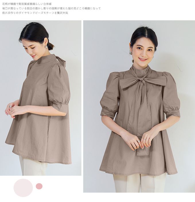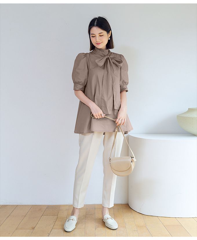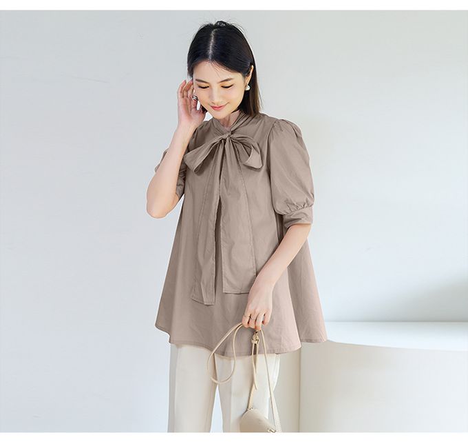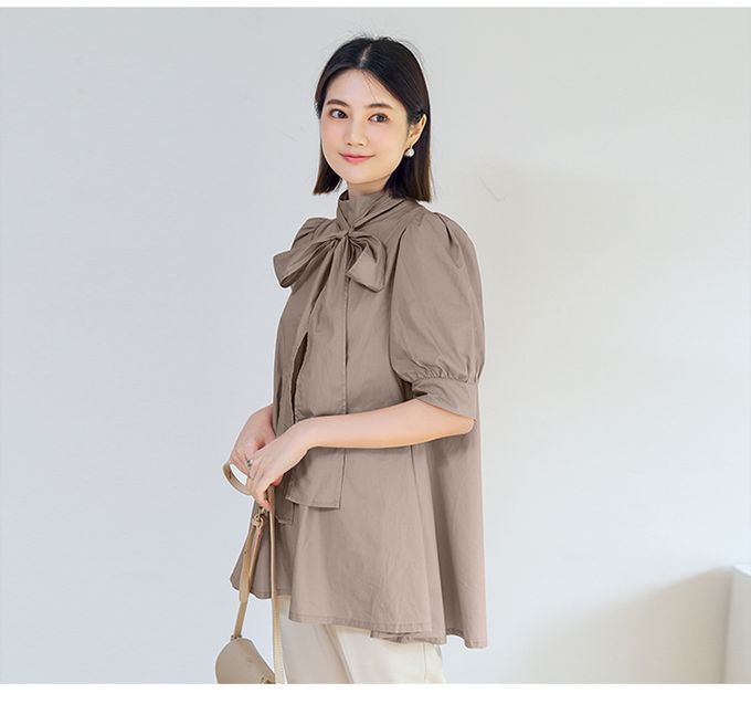 優雅小立領燈籠袖上衣-蝴蝶結-卡其色 (F)