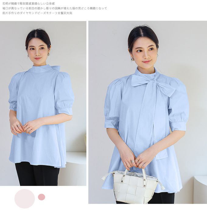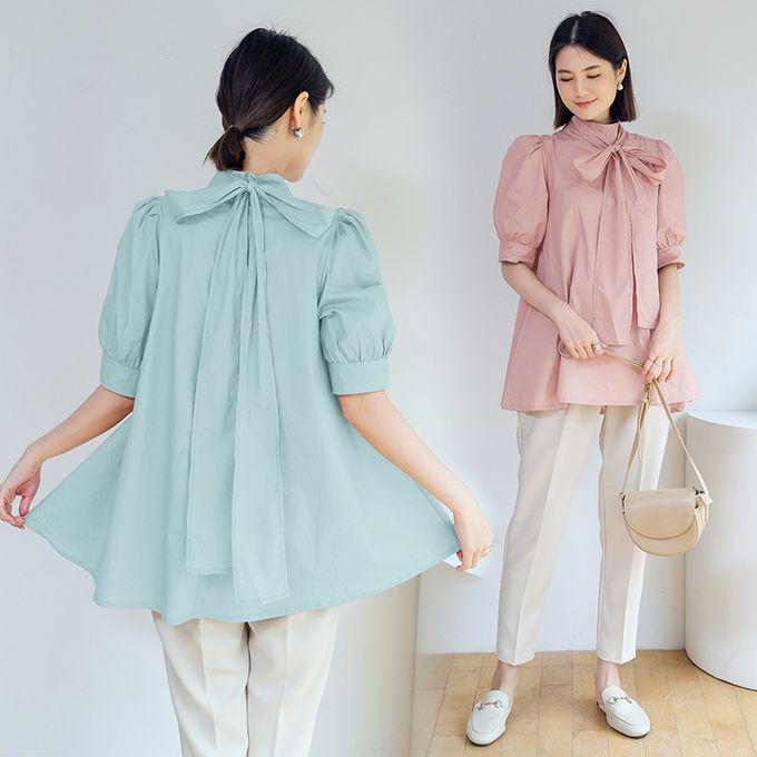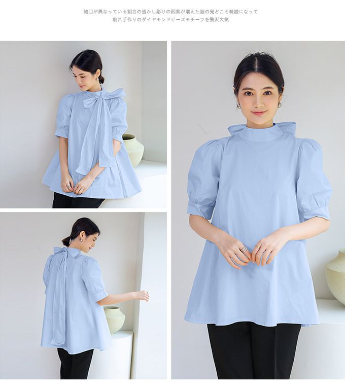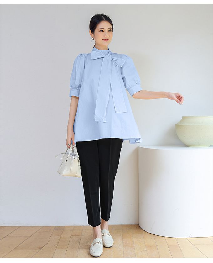 優雅小立領燈籠袖上衣-蝴蝶結-天藍色 (F)