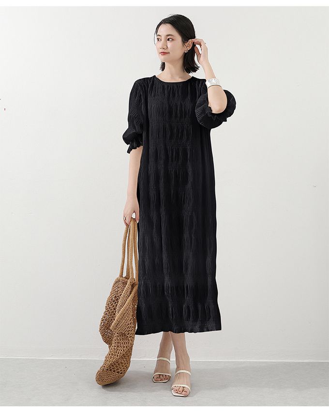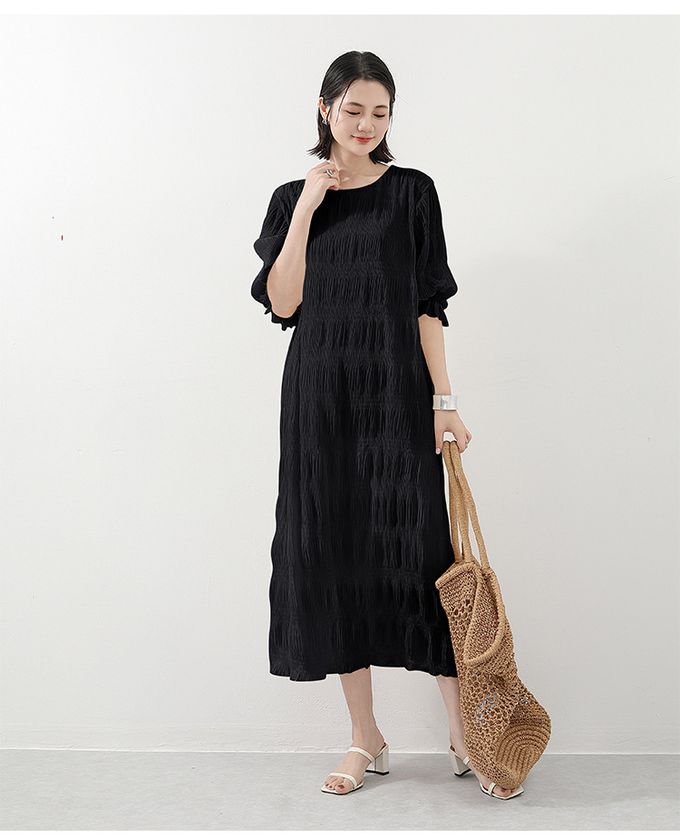 氣質滿分壓摺雪紡泡泡袖長洋裝-黑色 (F)