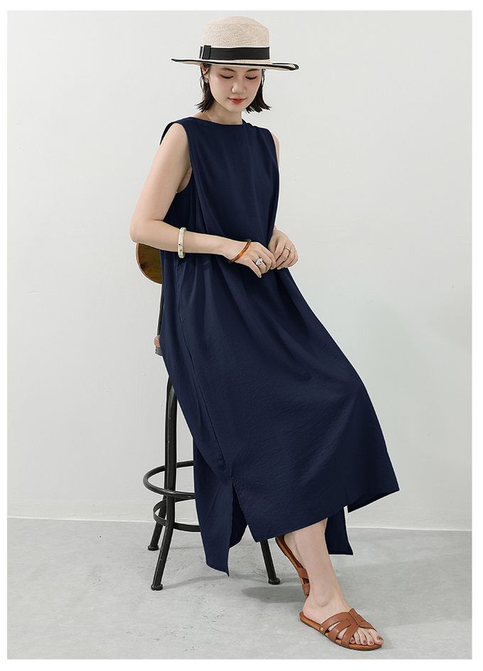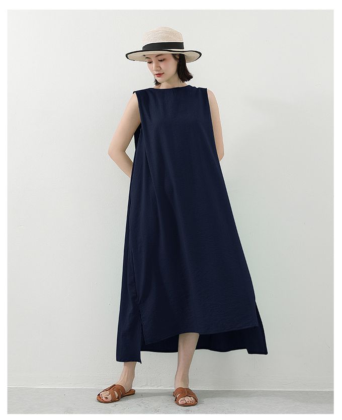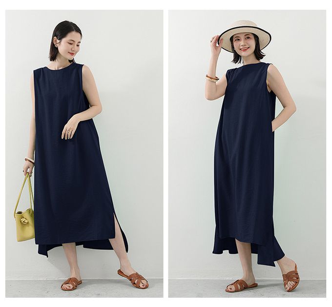 Yukié - 日系極簡風圓領百搭長洋裝-藏青色 (F)