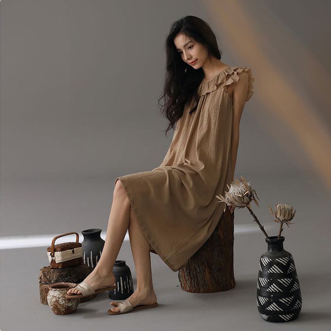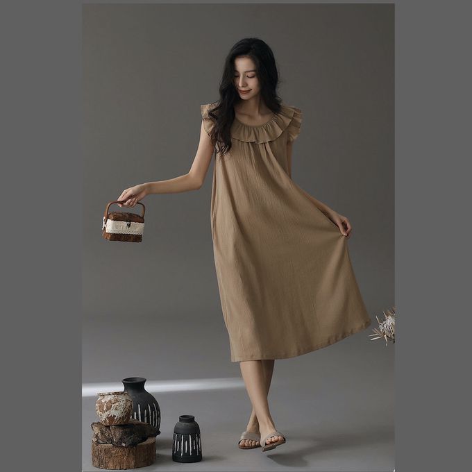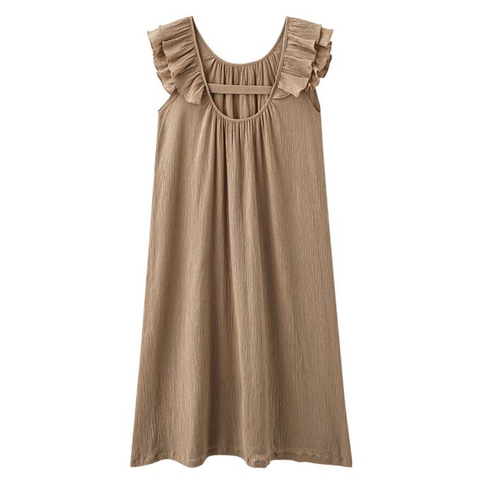 沉寂極簡風全棉双層皺紗荷葉袖洋裝居家服-寬鬆版型-沙漠卡其色 (均碼)