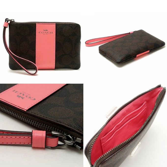 拼接皮革L型拉鍊手拿包 (咖啡胭脂粉)