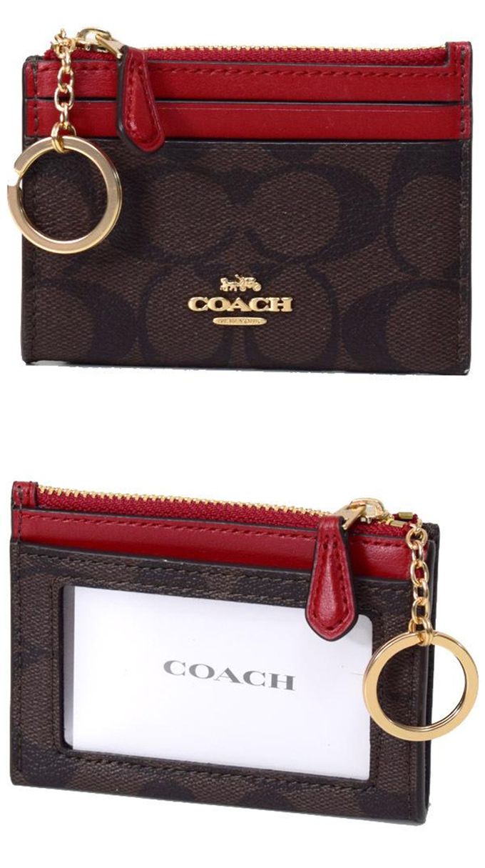 滿版LOGO拼接皮革卡片零錢包 (咖紅)