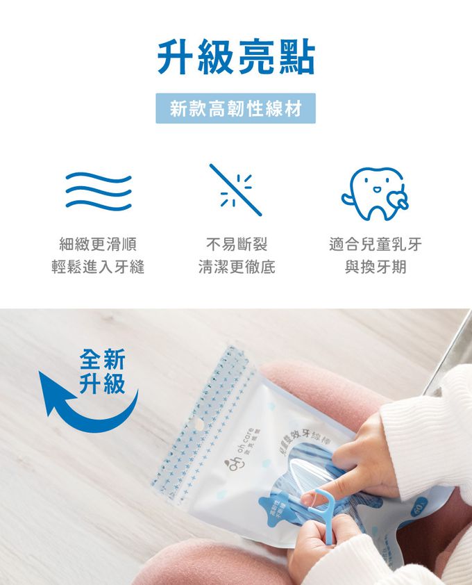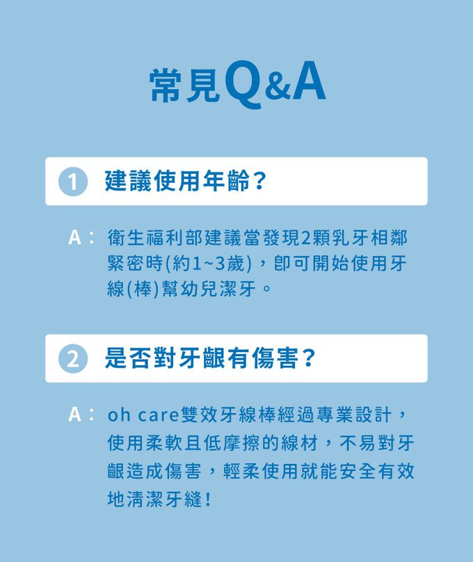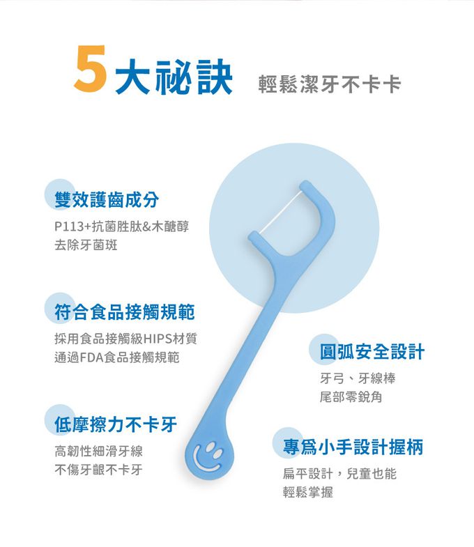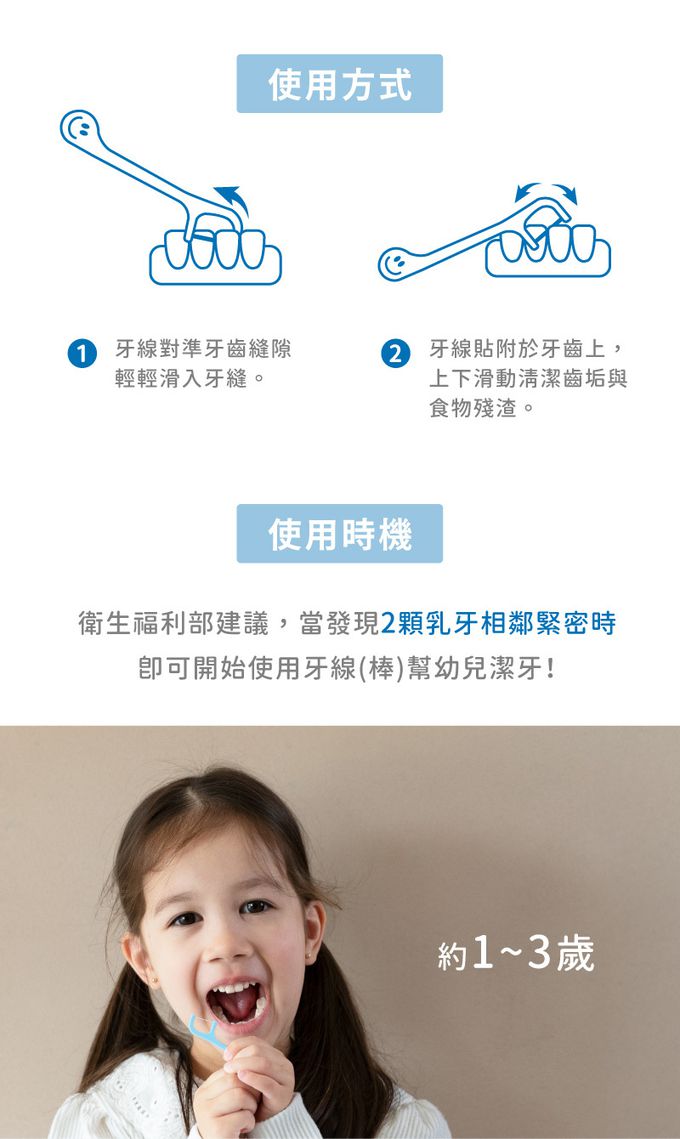 注意事項:兒童請由家長陪同使用。使用過程中請勿用力拉扯或過度施力,避免傷害牙齦。若使用後有牙齦或牙齒不適、出血或疼痛等現象,請立即停止使用,並請諮詢牙醫。