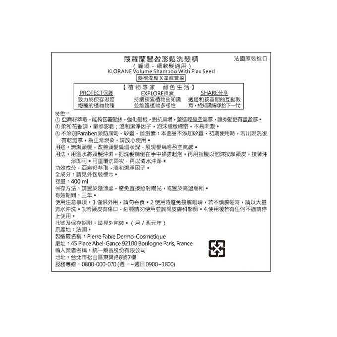 品名:蔻蘿蘭 豐盈澎鬆洗髮精(400ml/瓶)