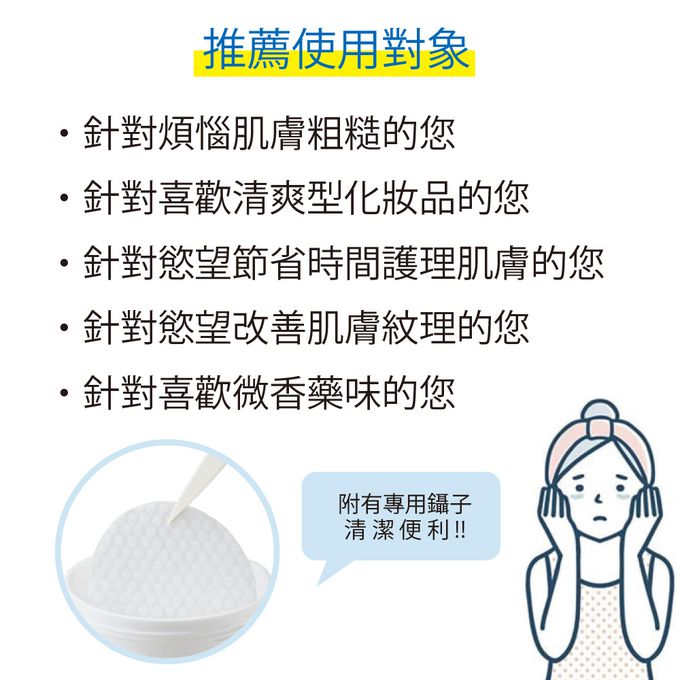 使用方式:清潔肌膚 洗臉後拭乾水份,以內附的棉片,塗抹於全臉並輕拍按摩幫助吸收。
