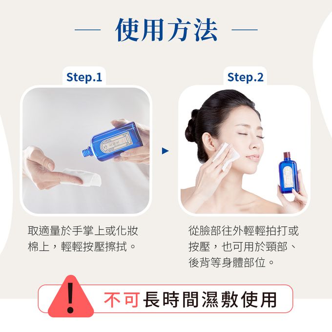 注意事項:1.肌膚敏感者,第一次使用建議請先小範圍測試,無刺激反應方可使用。 2.萬一誤入眼睛,請立即用大量清水沖洗。 3.當皮膚有傷口或濕疹等異常情況時,請勿使用。 4.使用後皮膚發生異常現象時,請停止使用,並諮詢皮膚科醫生。 5.本產品屬化粧品,不具醫療效能。