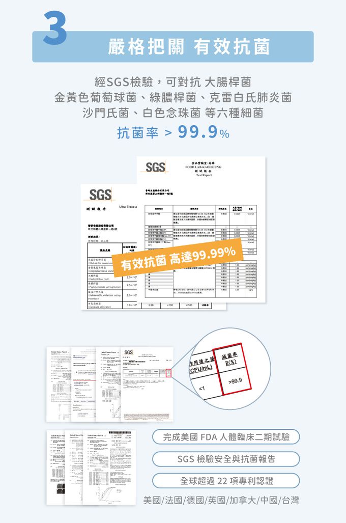 產品相關安全檢驗報告:經SGS檢驗,抑菌率>99.9%