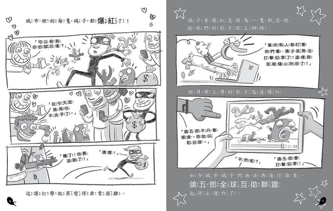 這本書結合了精彩(而且絕對讓孩子笑不停)的故事,和引人入勝、細節精緻的插圖,每一頁的每一格圖畫,都充滿趣味和值得探索的元素,是一本非當適合低中年級孩童閱讀的圖文讀本,既能用童趣和笑點滿滿的圖像來引發孩子們的閱讀興趣(在垃圾桶裡開會跟各種偽裝的場景真的很好笑!),同時也能培養他們的推理能力和觀察力,讓孩子們在閱讀過程中,跟著鴿子們感受到當偵探解謎、打擊犯罪的刺激和樂趣!