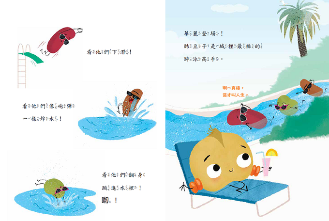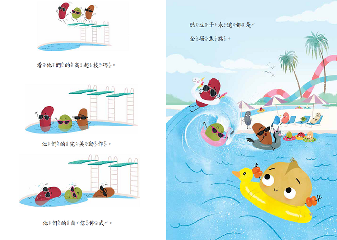 夏天來臨,酷豆子們到泳池戲水,展現了令人驚艷的游泳技巧。然而,泳池的淺水區卻是主角唯一感到安心的地方。儘管他試著做些酷動作來吸引大家注意,卻總是失敗、出糗。直到他看見那座很高很高的滑水道,決定挑戰自我,他告訴自己:「只要征服超級滑水道,他也能像酷豆子們一樣酷。」然而,當他爬到頂端時,卻開始忍不住顫抖,究竟他能不能成功克服恐懼,勇敢溜下去呢?