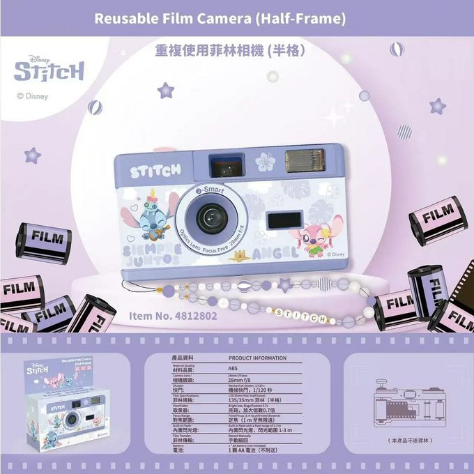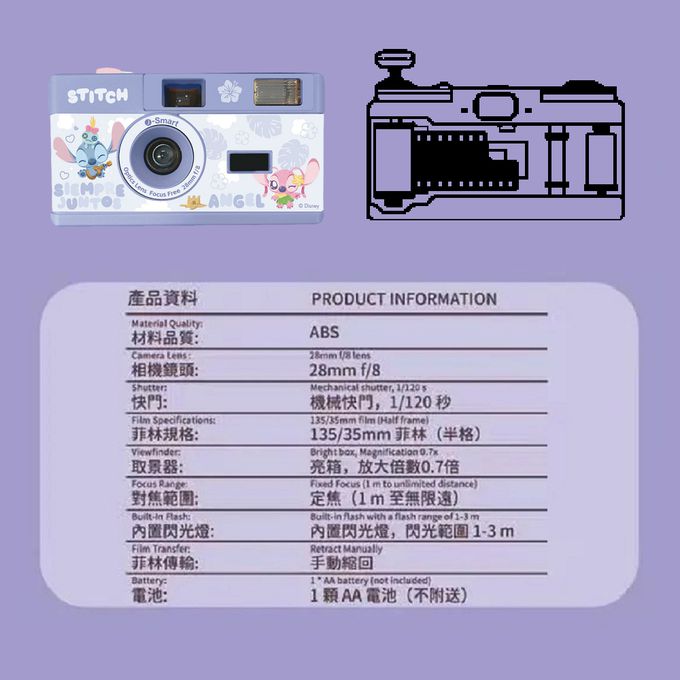 相機規格:半格菲林底片相機材質:ABS及PCB板鏡頭:28mm,F8對焦範圍:定焦 (由1米至無限遠)快門:1/120秒底片格式:135/35mm (半格)閃光燈 : 內置閃光燈,閃光範圍1至3米電源:AA x 1(鹼性電池)(本產品不含電池)重量:110g (不含電池)尺寸:118 x 65 x 40 mm產地:中國