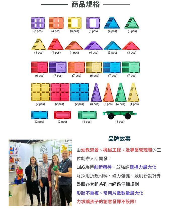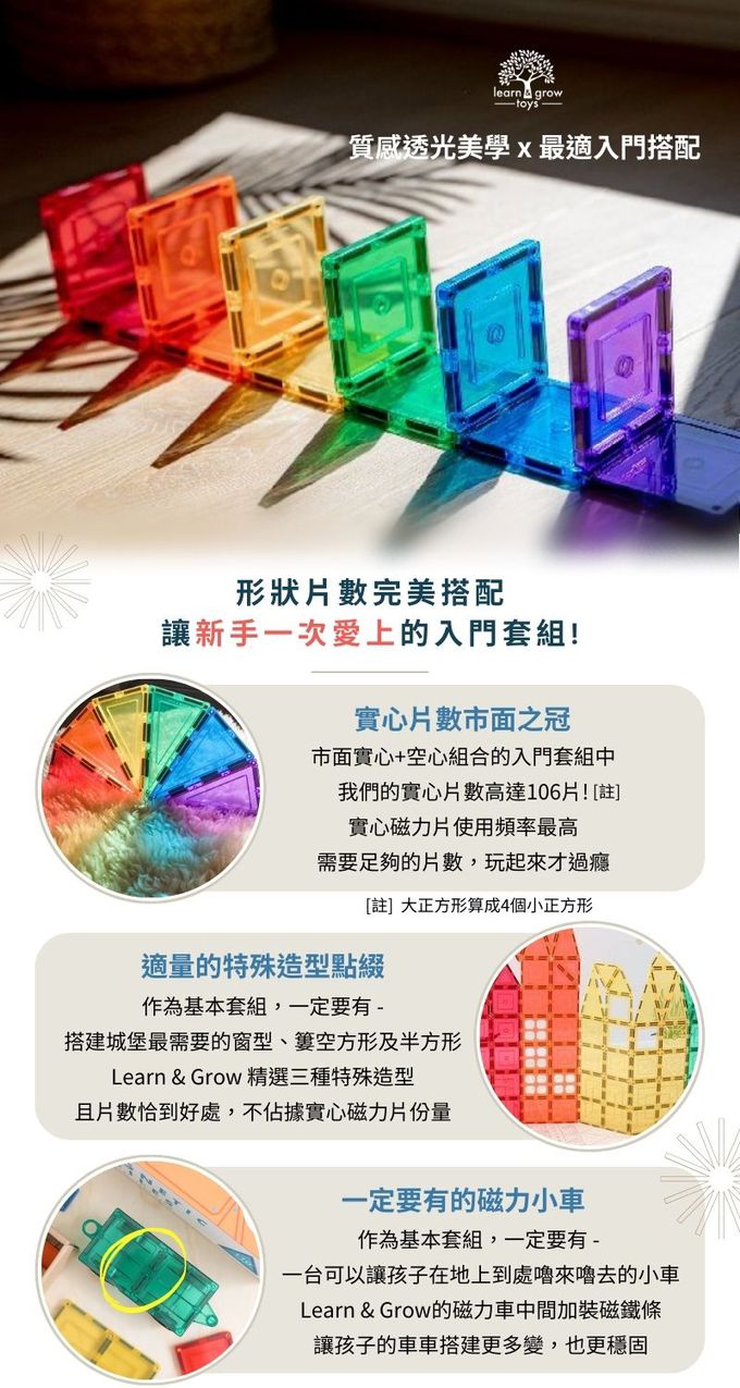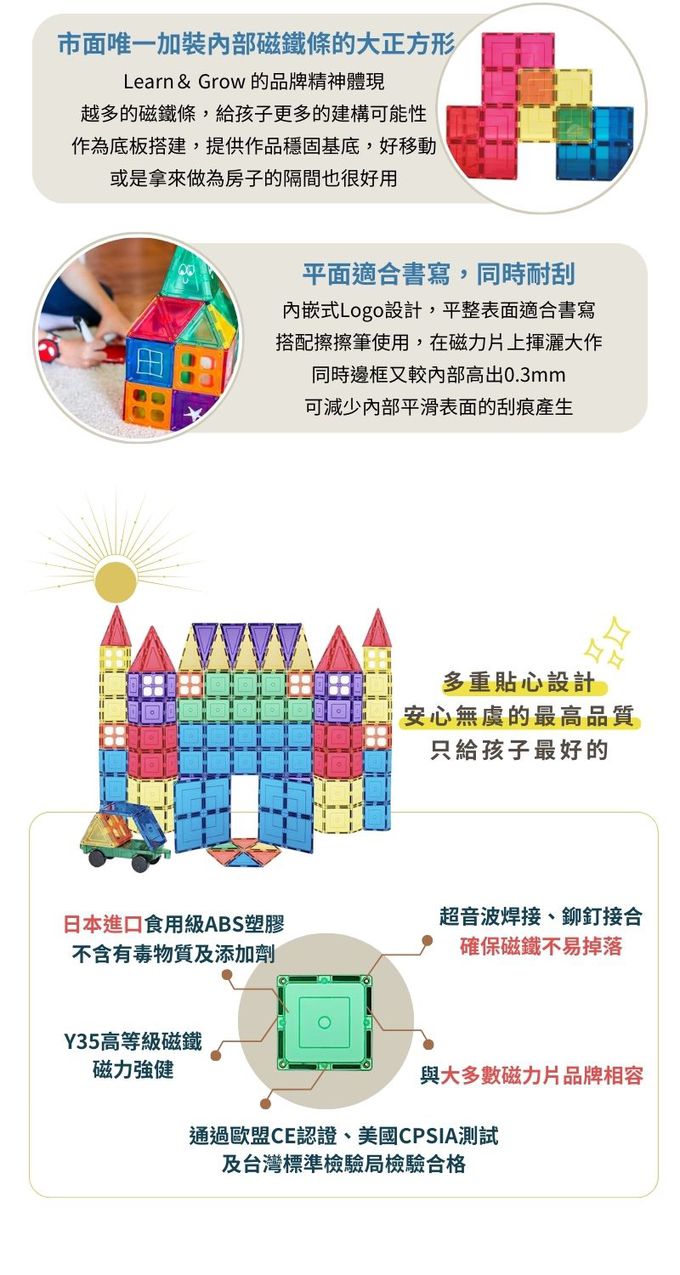 商品重(容)量:正方形 x 40 | 等腰三角形 x 14 | 直角三角形 x 14 | 正三角形 x 14 | 長方形(半正方形) x 8 | 窗形正方形 x 7 | 空心正方形 x 6 | 磁力基底車 x 1 | 大正方形(=4個正方形) x 6