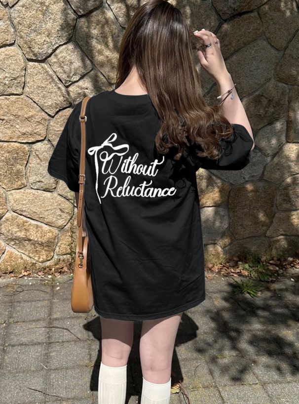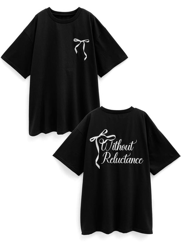 日本 GRL - 背後絲帶印花休閒長版T恤-黑 (F)