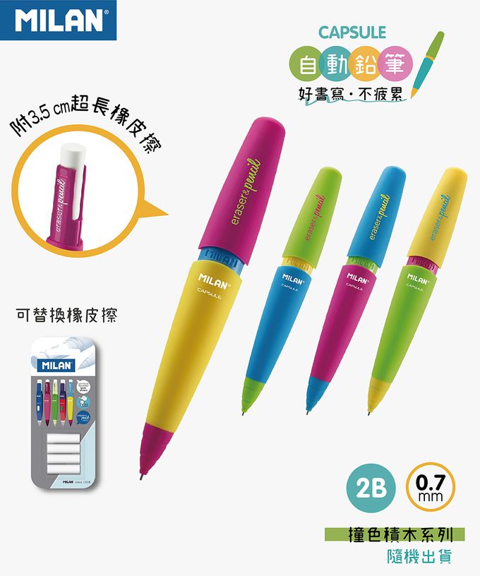 舒適好握 / 鮮明外觀設計 / 可替換式MILAN橡皮擦