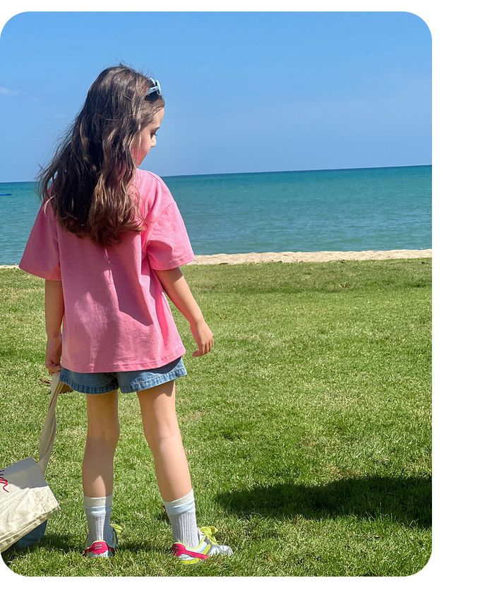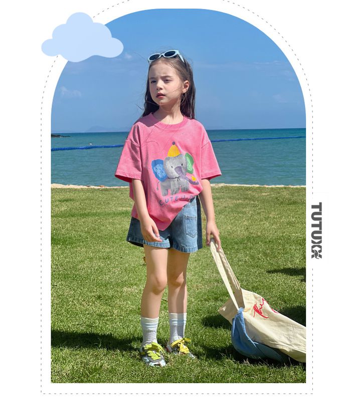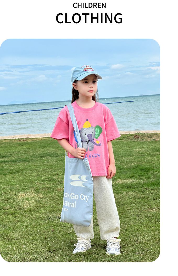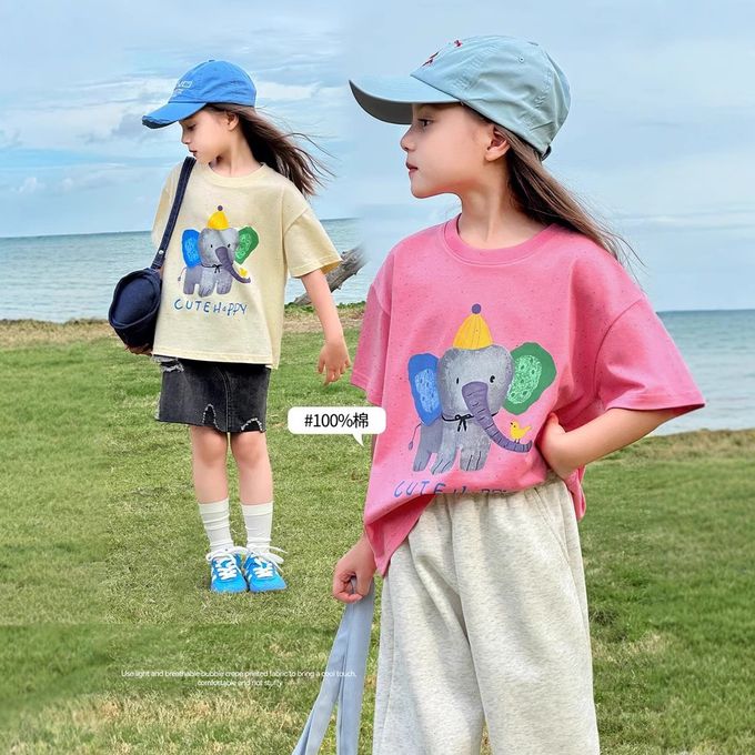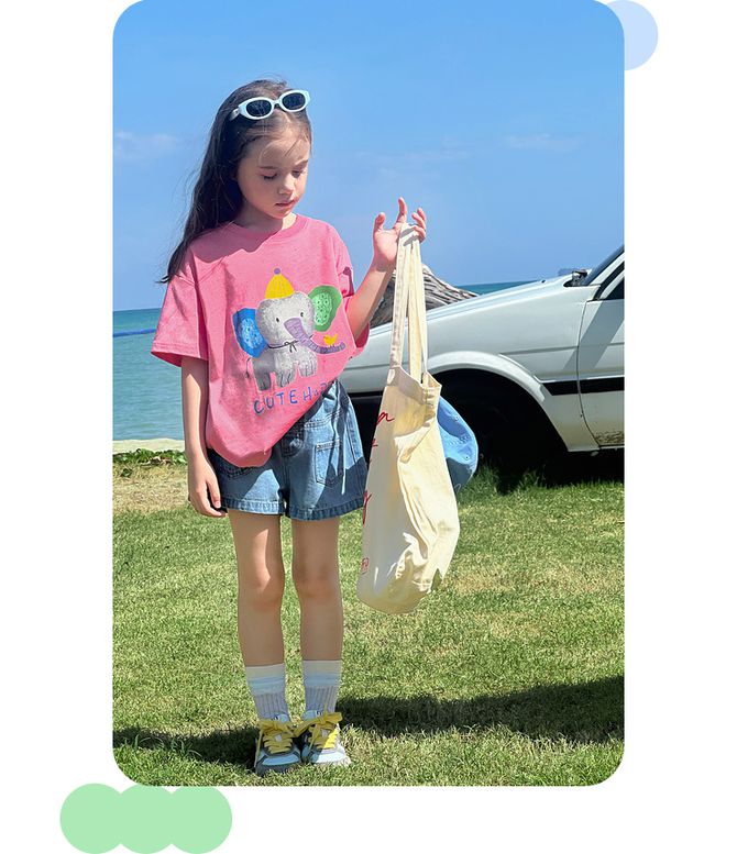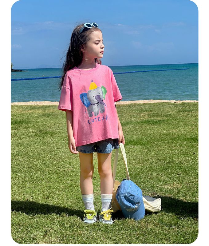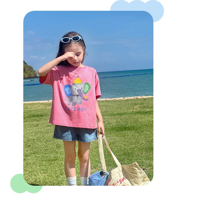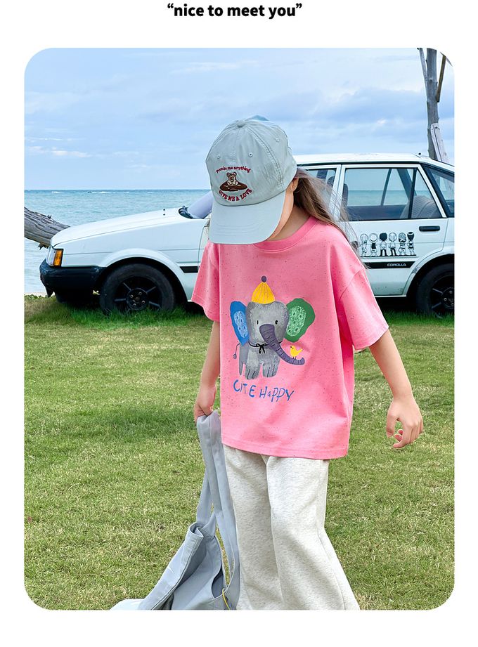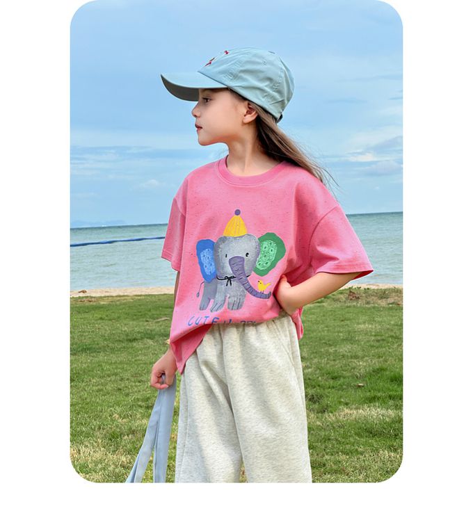 純棉圓領落肩短袖上衣/T恤-快樂大象-彩點粉