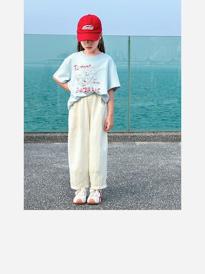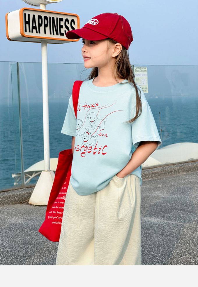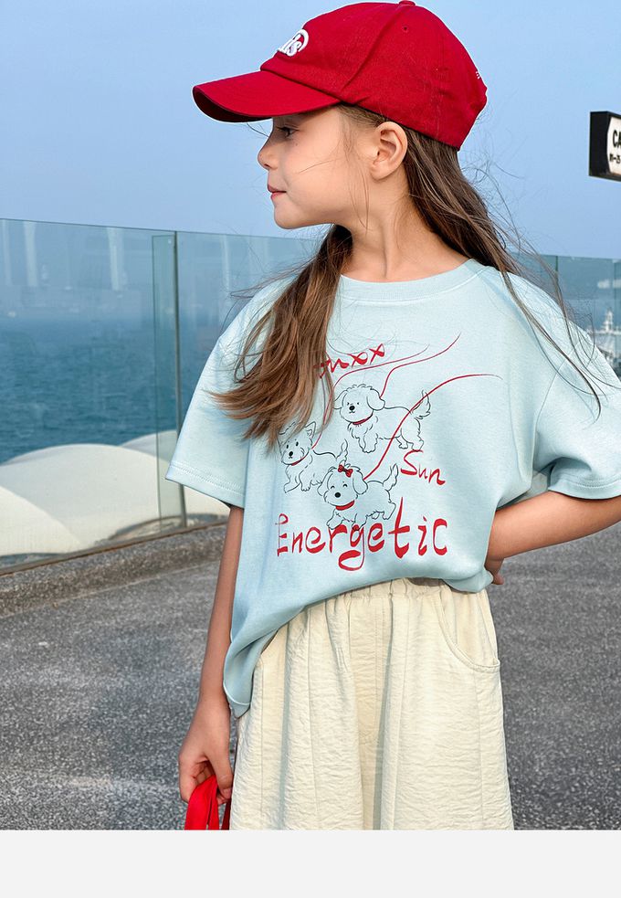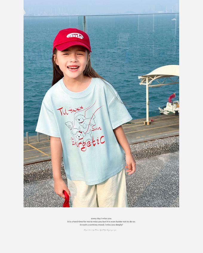 休閒圓領落肩短袖上衣/T恤-童趣萌繪-灰藍色