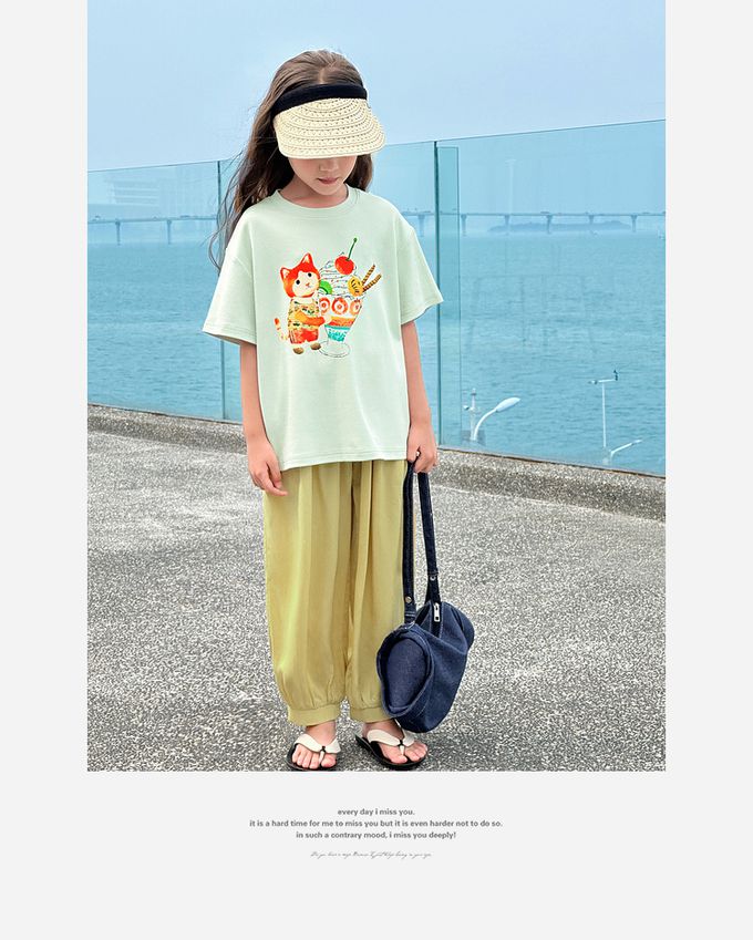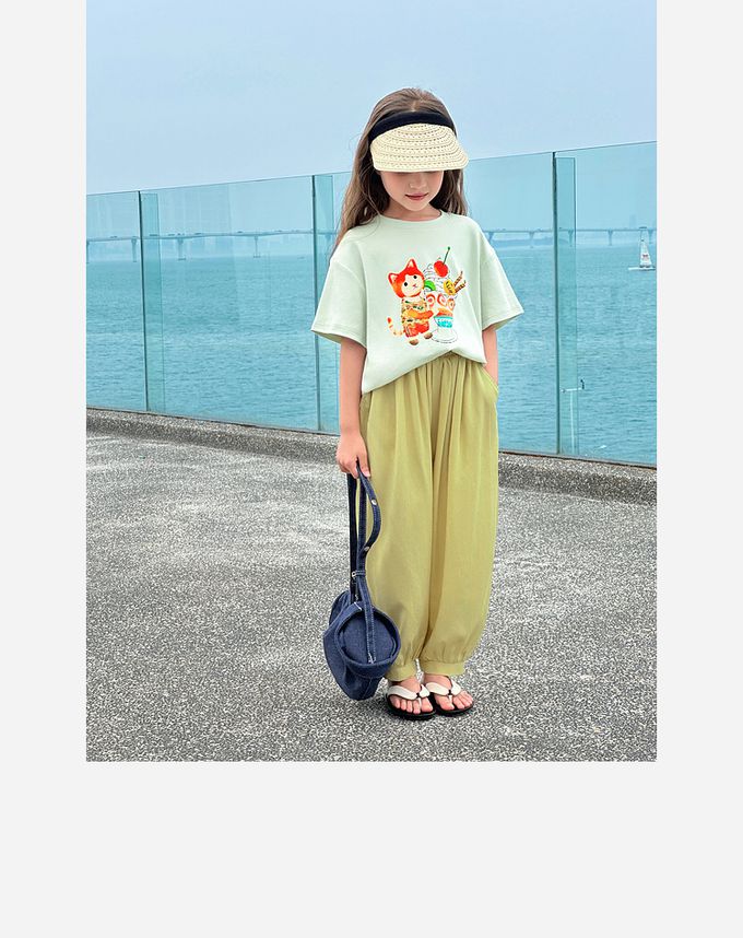 休閒圓領落肩短袖上衣/T恤-童趣萌繪-淺綠色