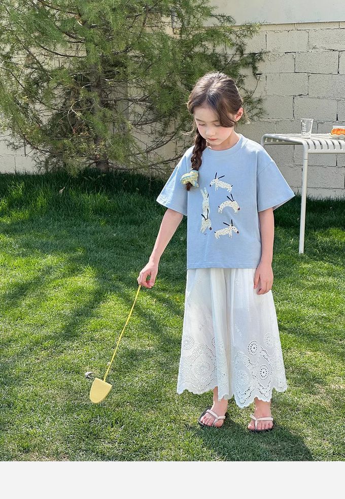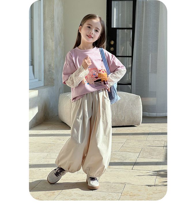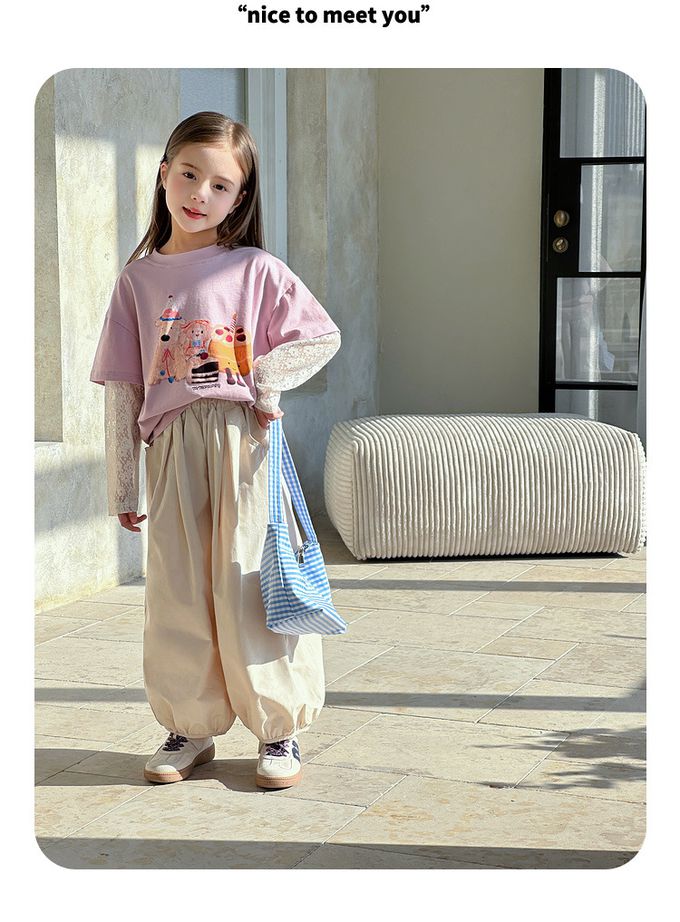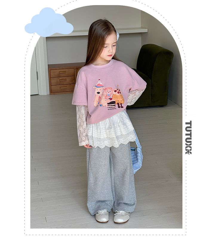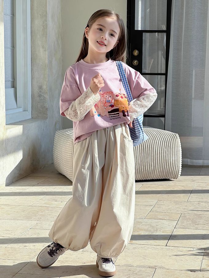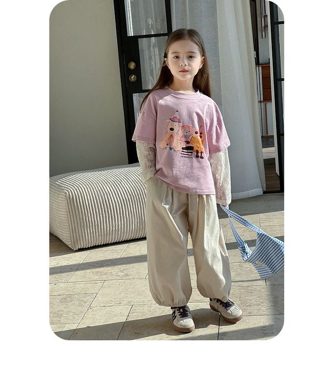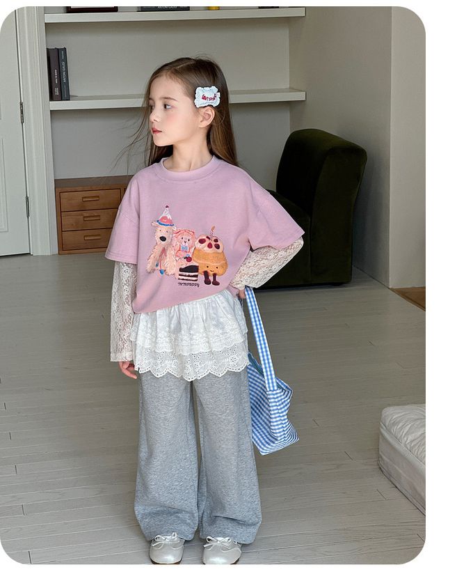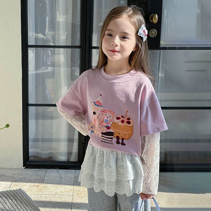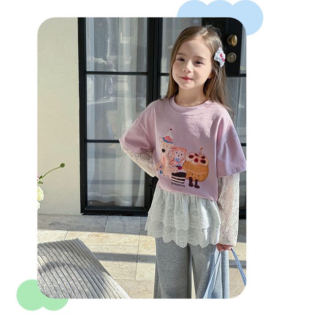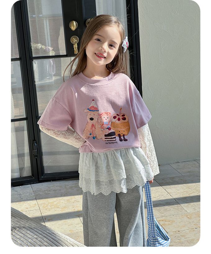 甜美圓領假兩件蕾絲拼袖上衣-卡通印花-粉色