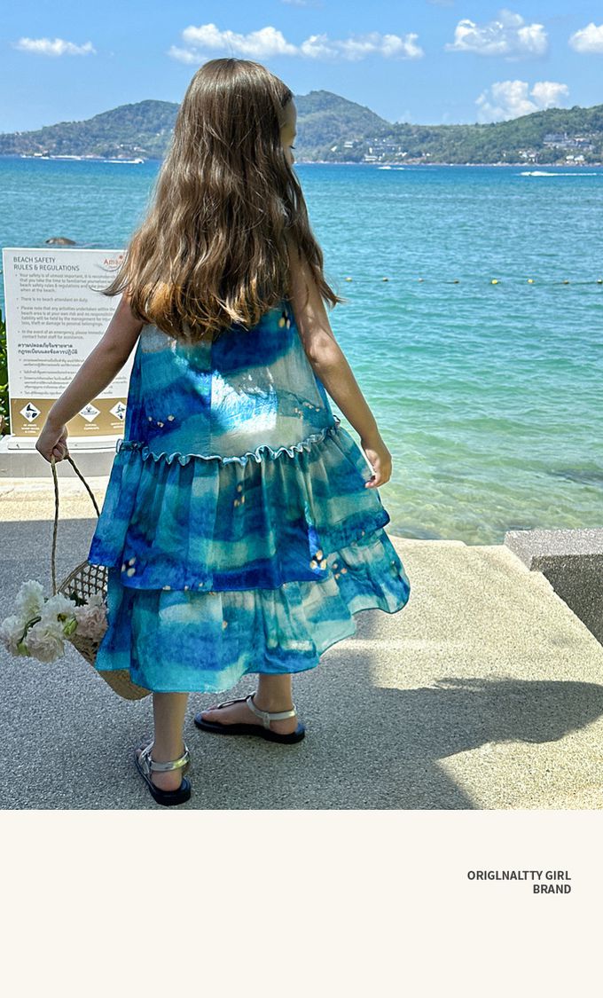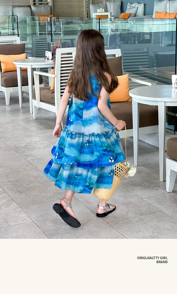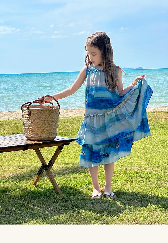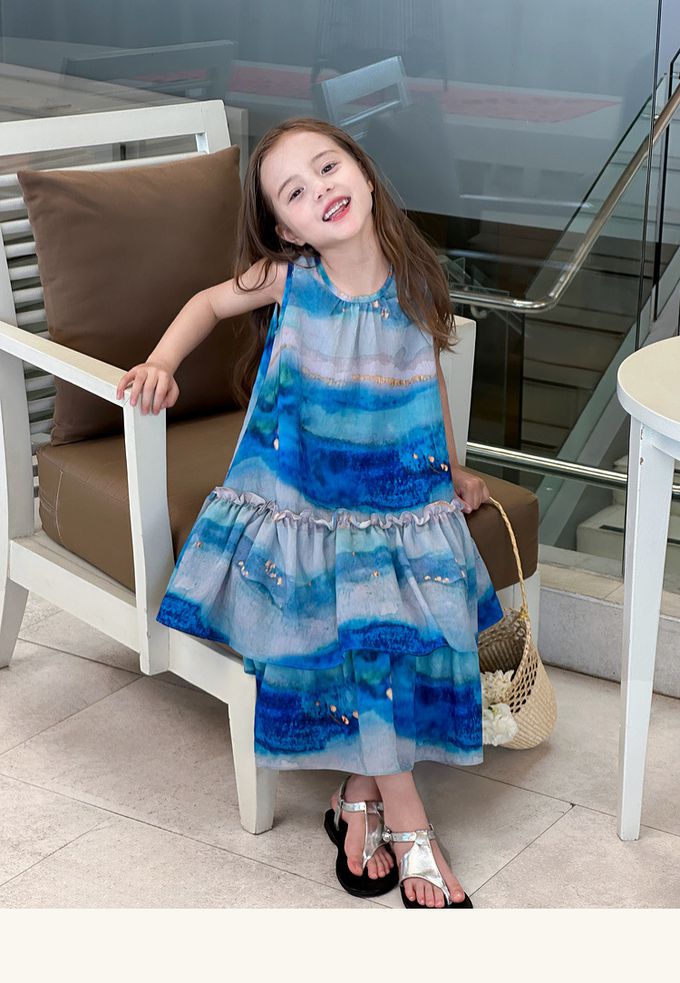蔚藍星海多層荷葉邊無袖洋裝-暈染藍