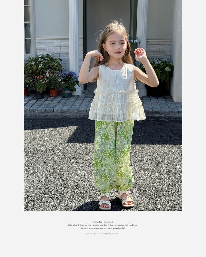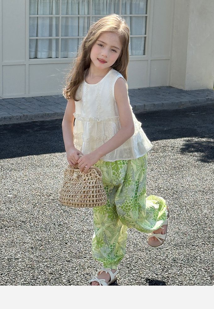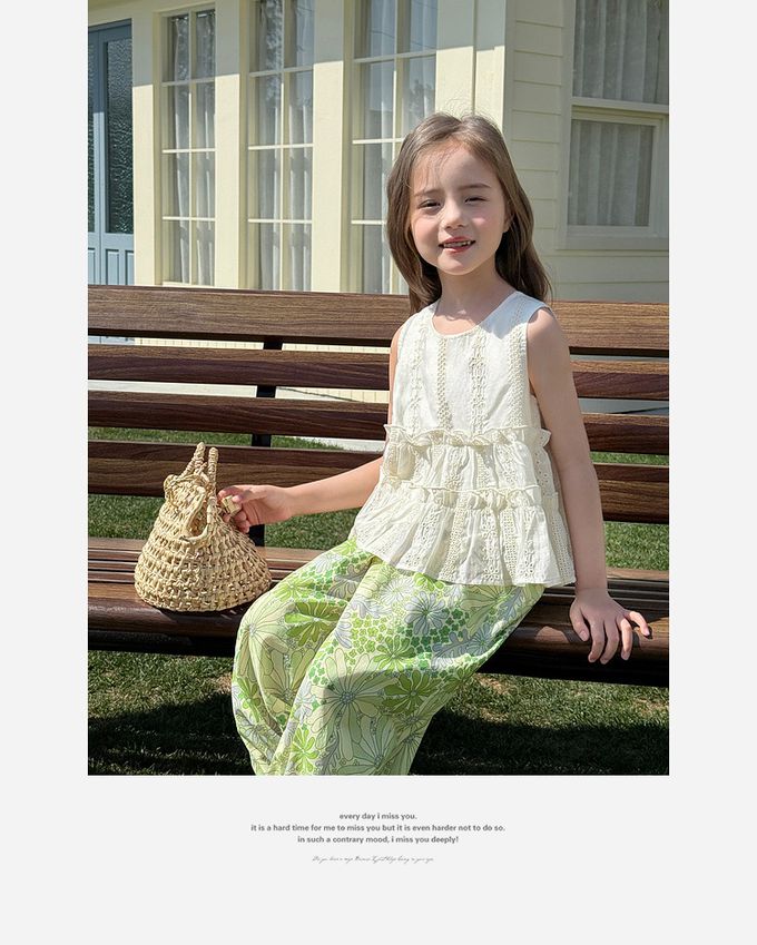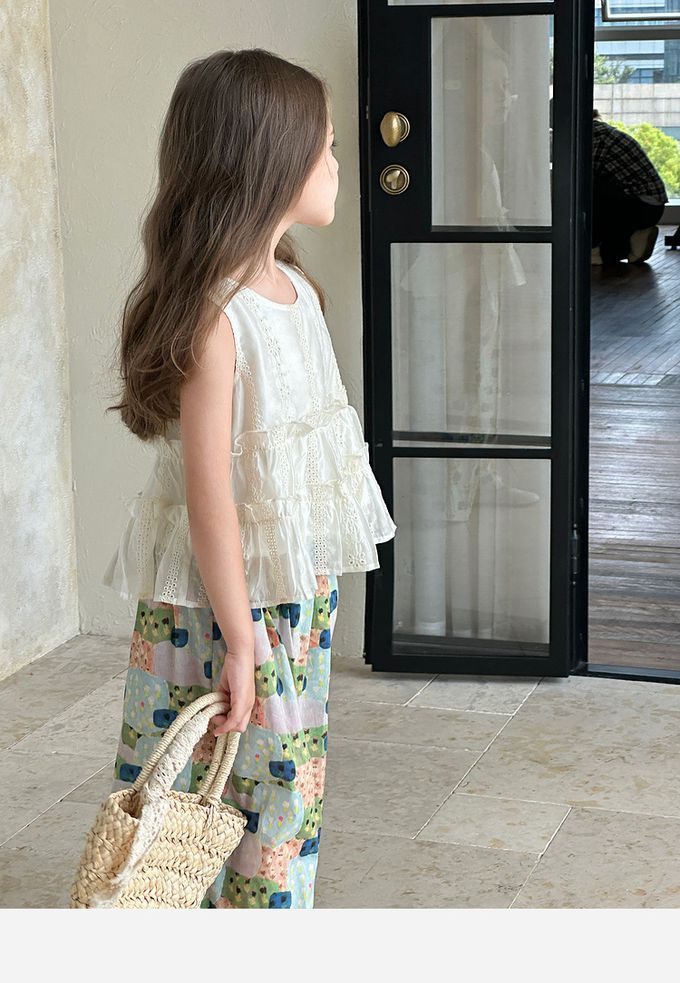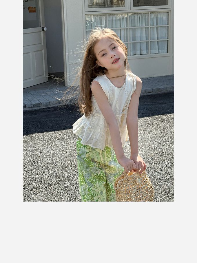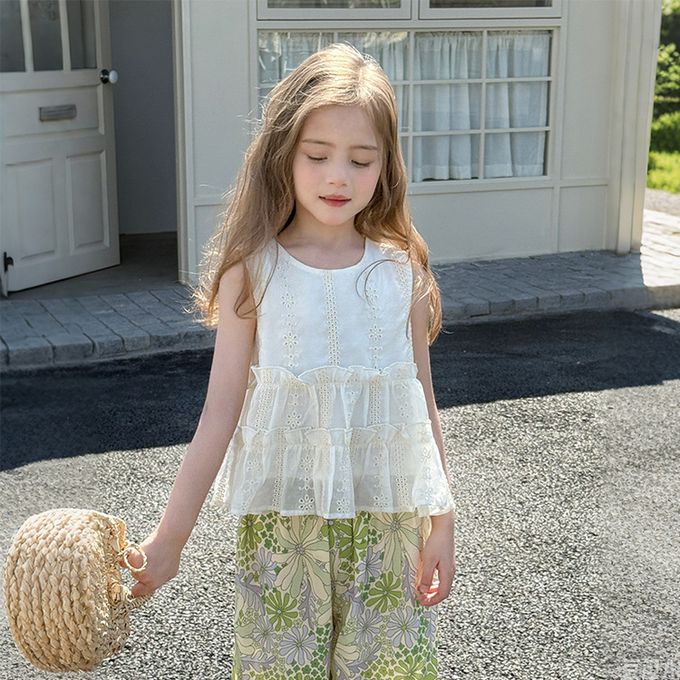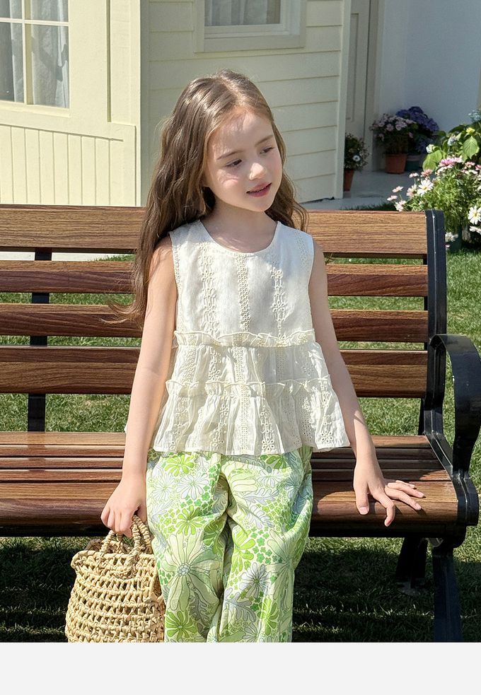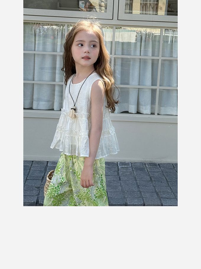 天絲法式簍空繡花荷葉邊背心-米杏色