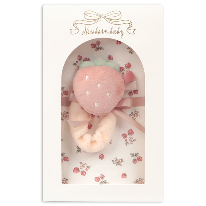 包巾與手搖鈴以蝴蝶結綁成一組裝入禮盒中。