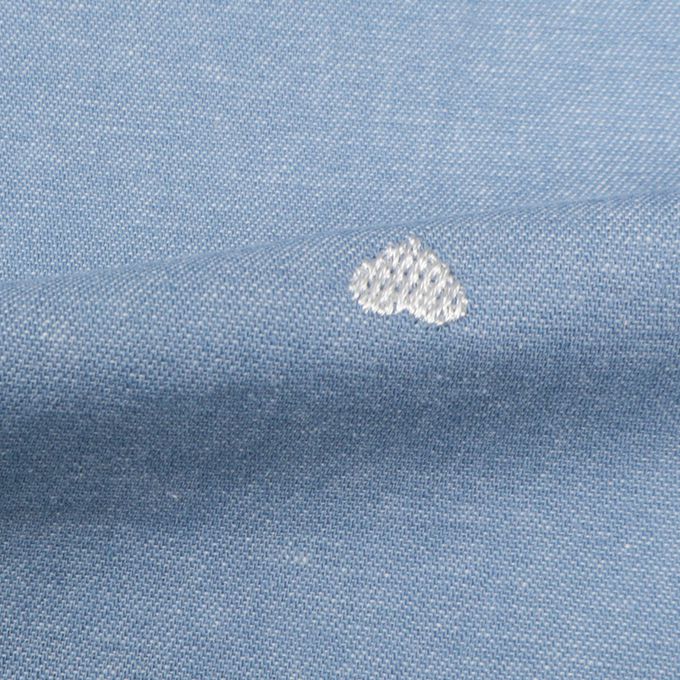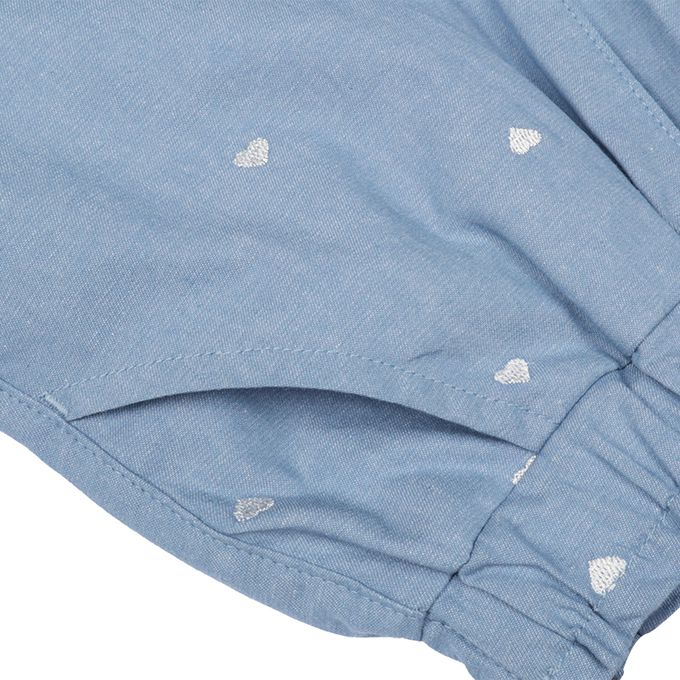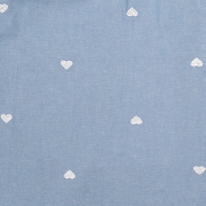 休閒風丹寧和上面有愛心滿版刺繡的細平棉布