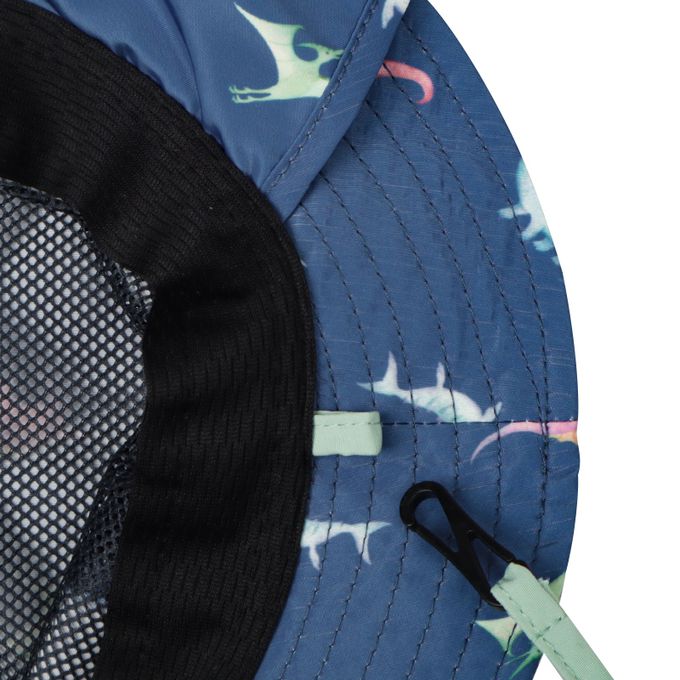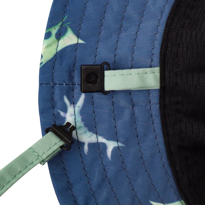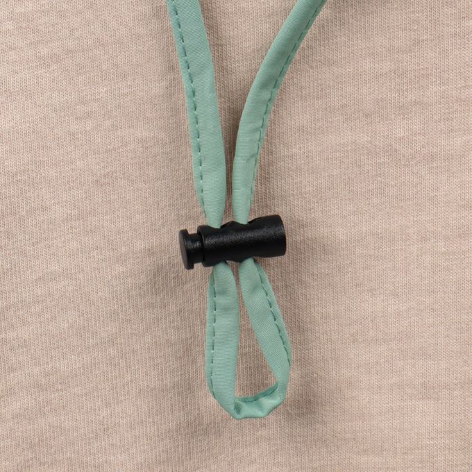 下巴有固定繩可防止被風等吹落。固定繩一側受到強力拉扯時會自動鬆開,另一側為掛鉤扣。