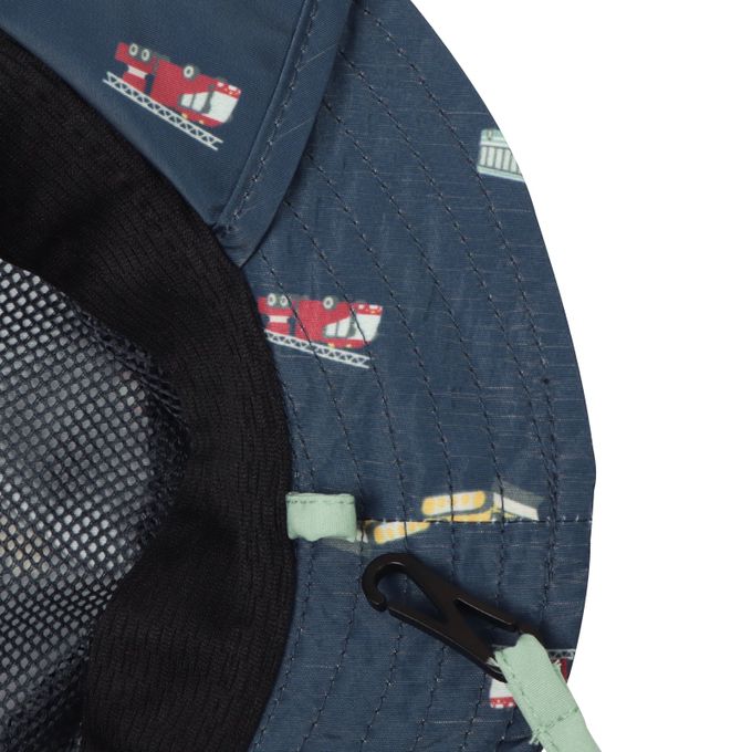 下巴有固定繩可防止被風等吹落固定繩一側受到強力拉扯時會自動鬆開,另一側為掛鉤扣。