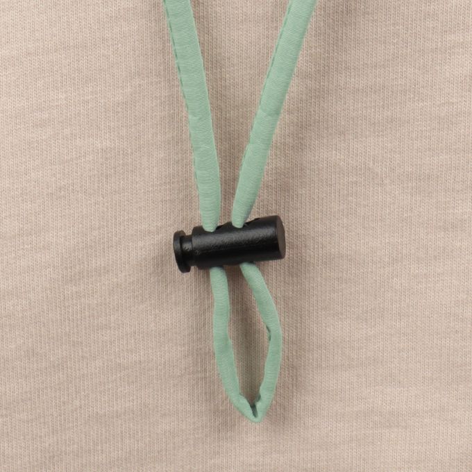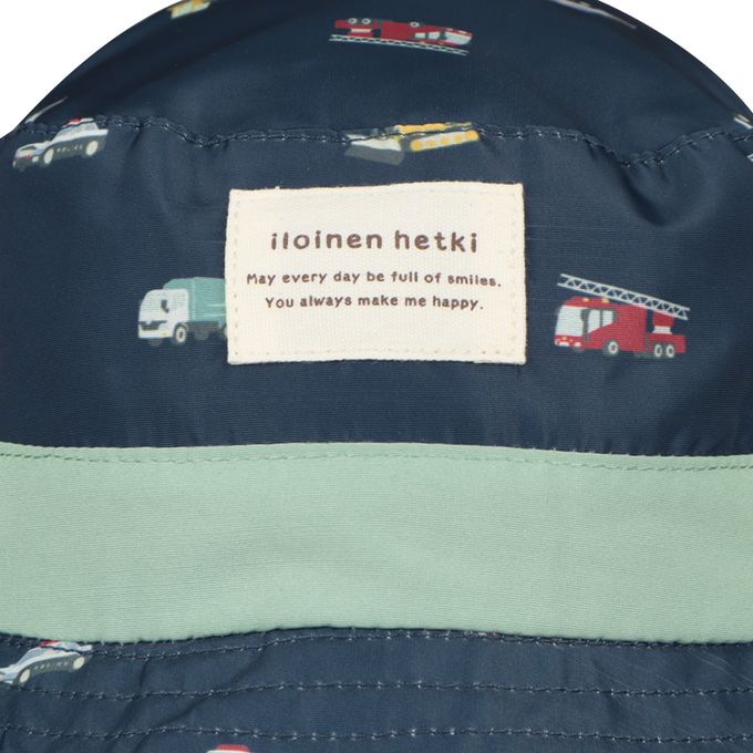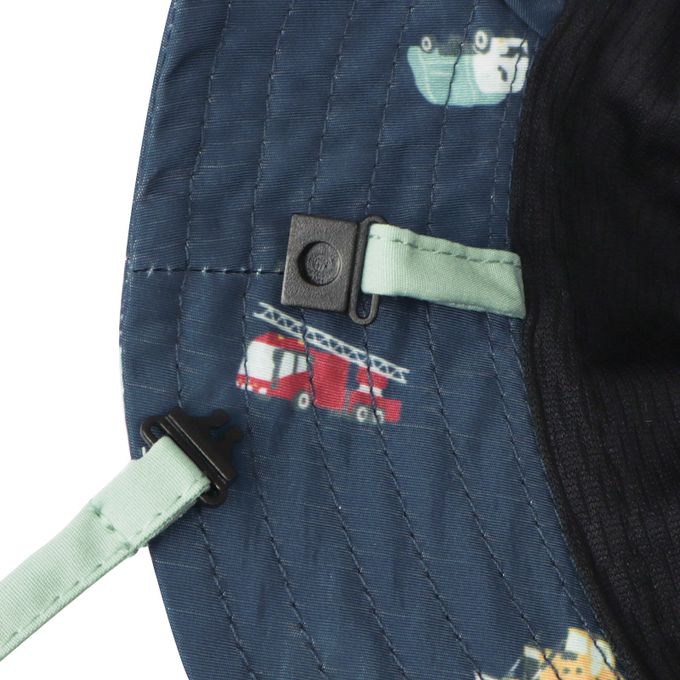下巴有固定繩可防止被風等吹落固定繩一側受到強力拉扯時會自動鬆開,另一側為掛鉤扣。