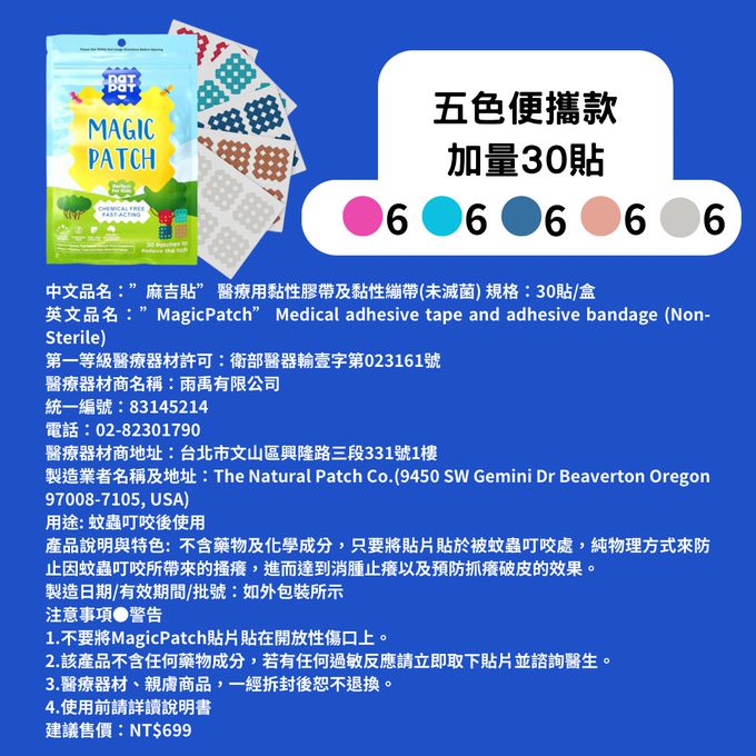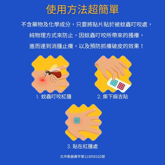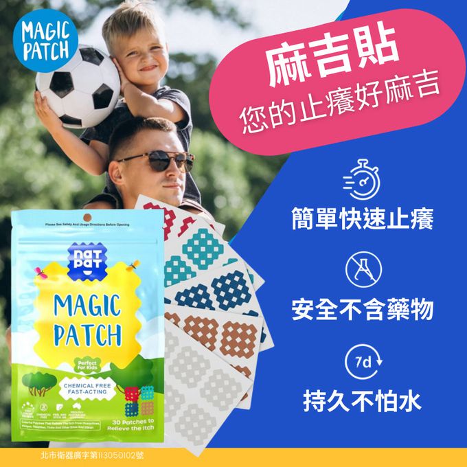 Magic Patch「麻吉貼」是一款不含藥物, 採用物理性的方式,來防護因叮咬後的搔癢紅腫抓破皮。通過拉提被蚊蟲叮咬後的表層皮膚緩解搔癢,利用純物理作用來達到消腫,安全有效!
