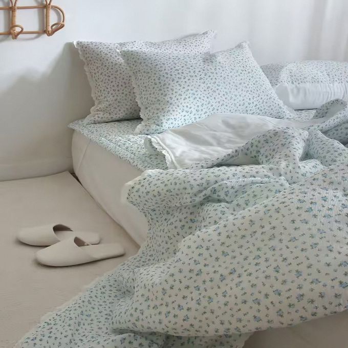 * 韓國手工製作/韓國原料* 不含甲醛,抗菌率高達99.9%,並通過檢測實驗室的產品安全標準認證* 涼爽柔軟的雙面材質,雪波紋+純棉* 外層 >> 高透氣性的雪波紋材質製成* 內層 >> 100%柔軟乾爽的棉* 這是一款雙面都可使用的被子* 優雅美麗的碎花圖案加上三邊可愛蕾絲花邊造型