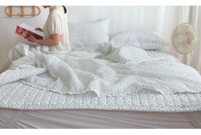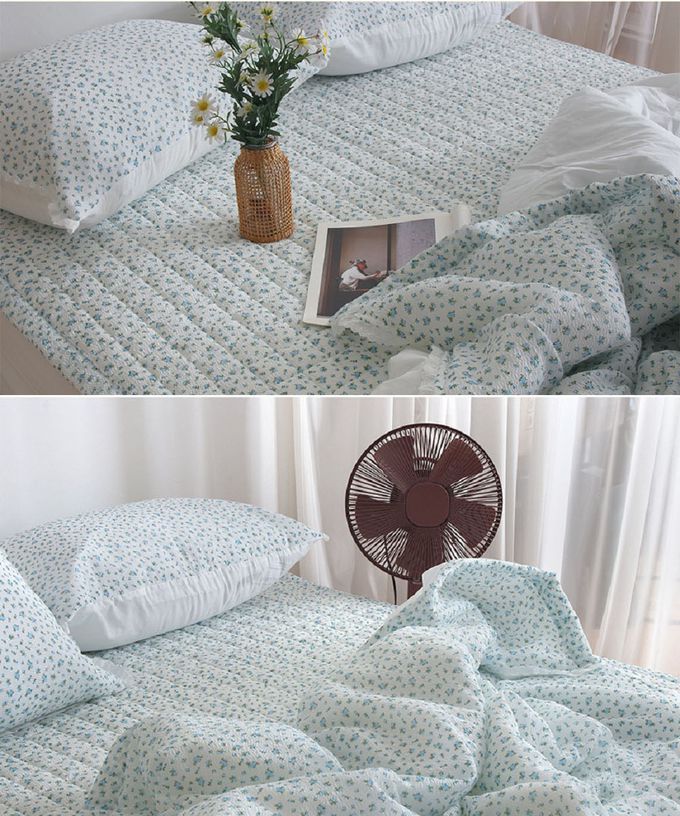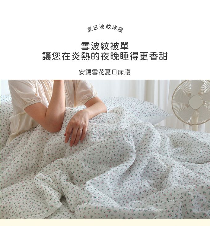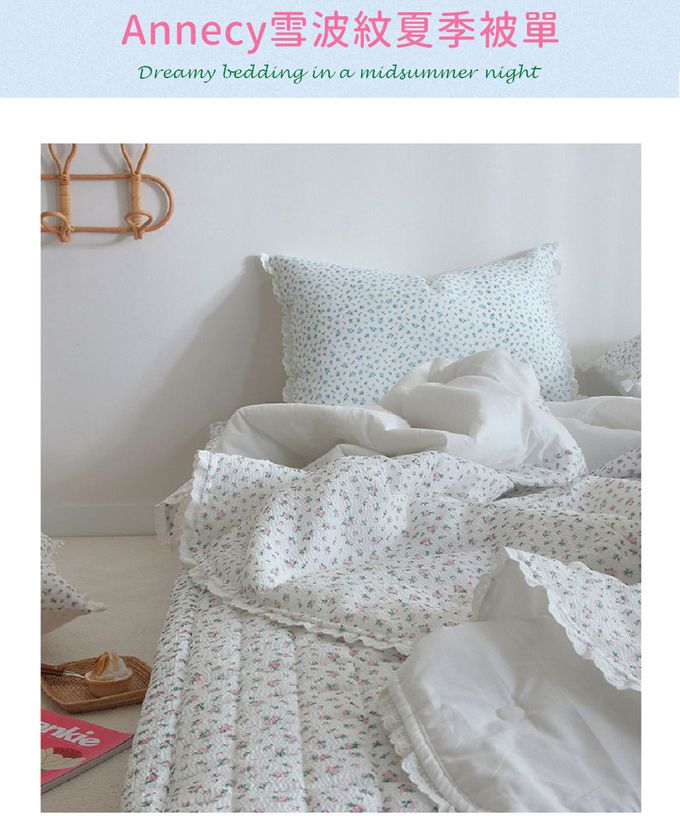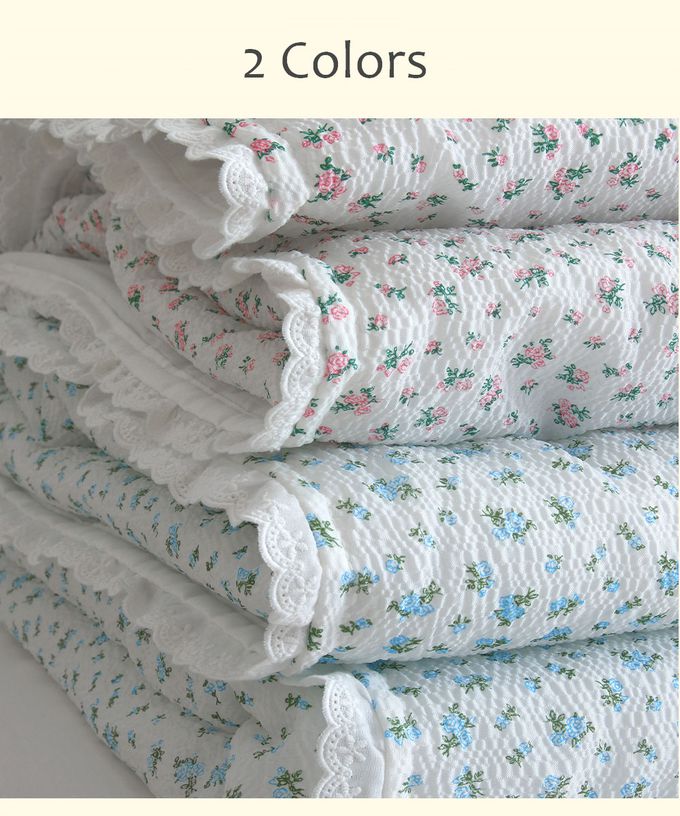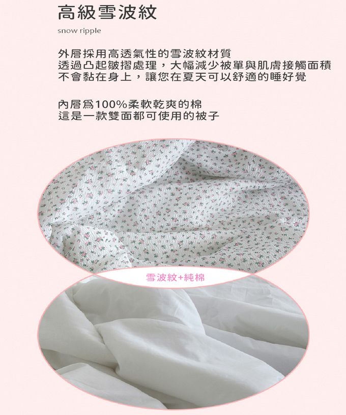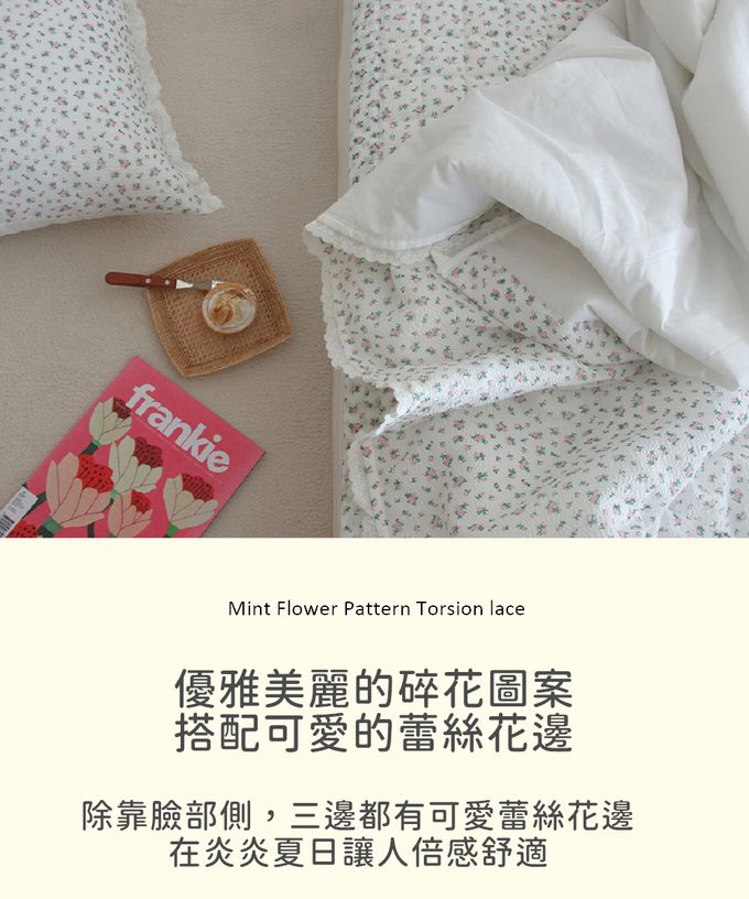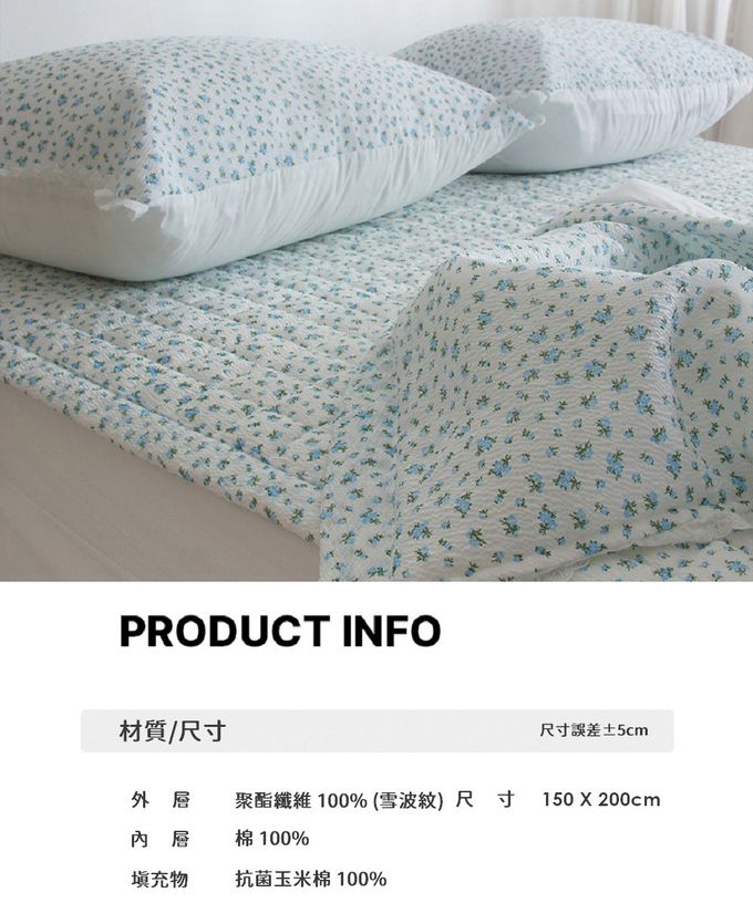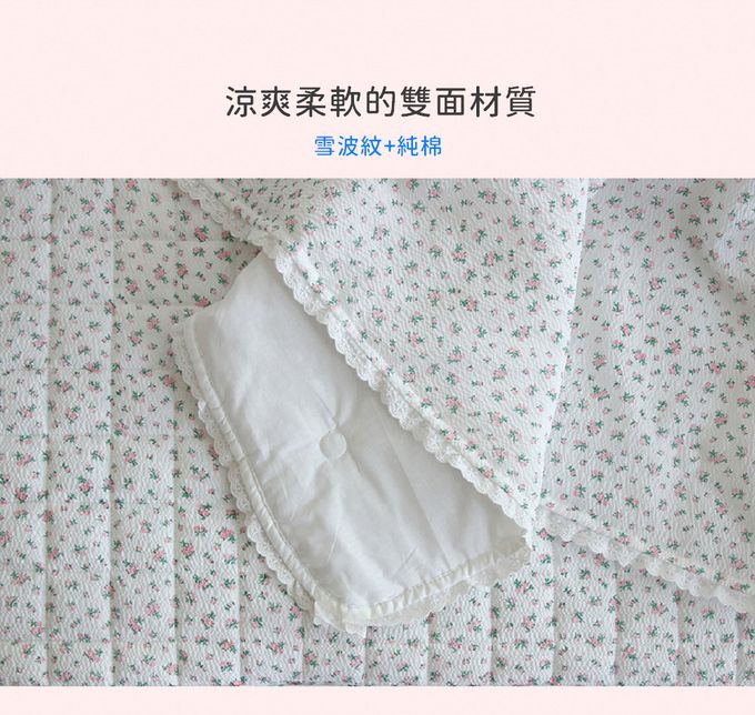 * 韓國手工製作/韓國原料* 不含甲醛,抗菌率高達99.9%,並通過檢測實驗室的產品安全標準認證* 涼爽柔軟的雙面材質,雪波紋+純棉* 外層 >> 高透氣性的雪波紋材質製成* 內層 >> 100%柔軟乾爽的棉* 這是一款雙面都可使用的被子* 優雅美麗的碎花圖案加上三邊可愛蕾絲花邊造型