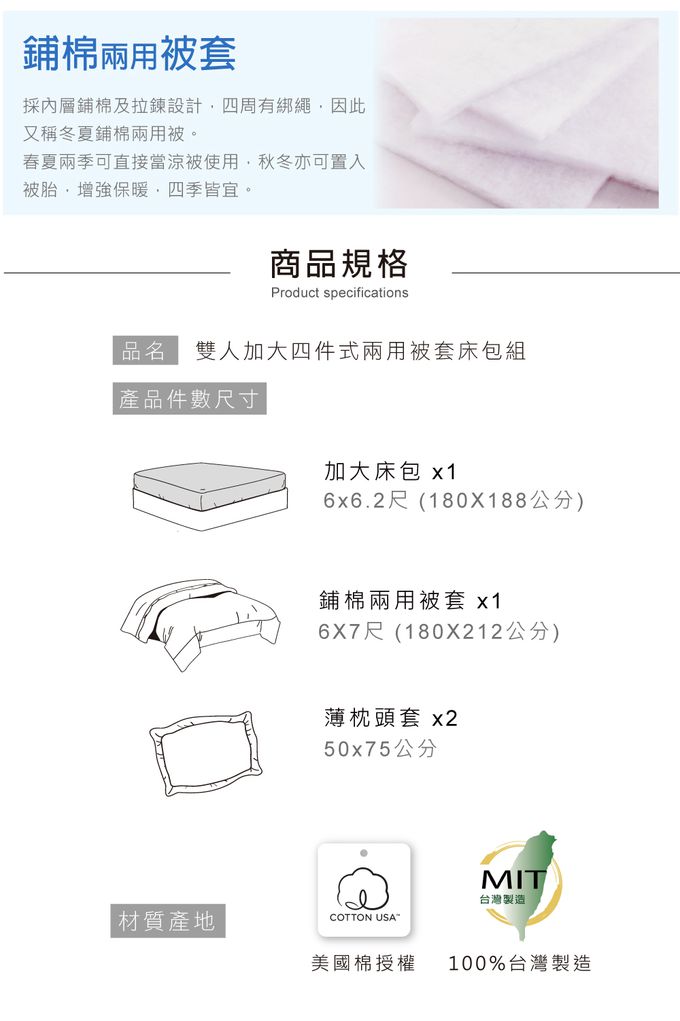內容物:床包1件+鋪棉被套1件+薄枕頭套2件