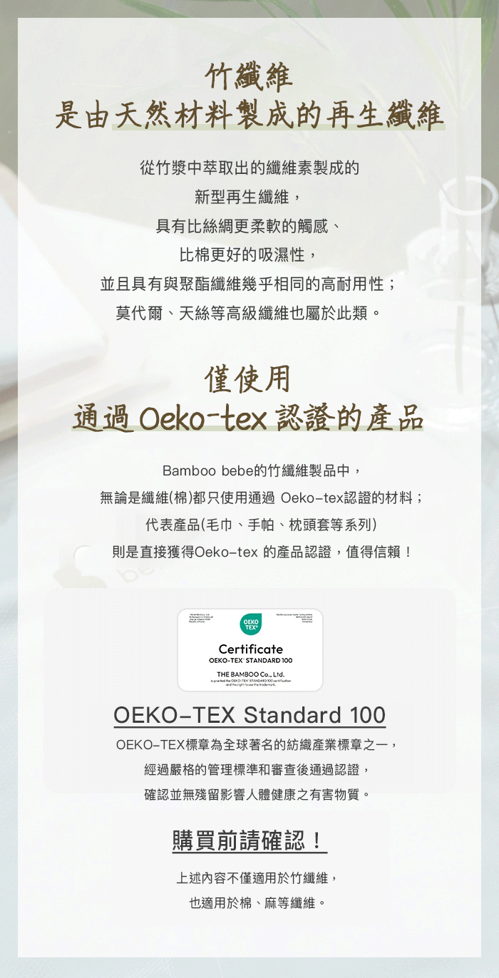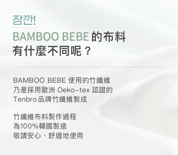 竹纖維細小的氣孔擁有出色的透氣和吸濕能力,因此Bamboo Bebe的紗巾、手帕使用起來更加舒適~他們家還是韓國唯一通過歐洲Oeko-Tex認證的品牌哦!且產品通過有害物質測試:無添加螢光劑、農藥及化學肥料,不會刺激寶貝嬌嫩的肌膚~!