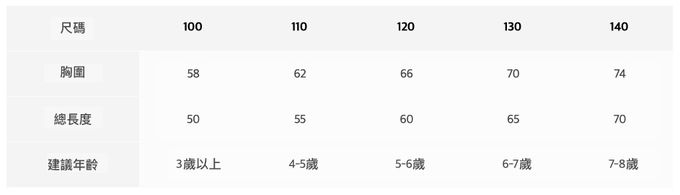2. 平均尺寸表乃參考平均值制定,每位孩童成長速度略有不同,請參考孩子實際體型、現有衣物尺寸等實際測量結果進行選購。