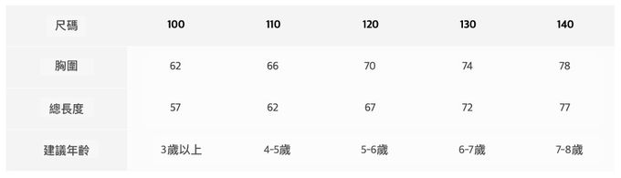 2. 平均尺寸表乃參考平均值制定,每位孩童成長速度略有不同,請參考孩子實際體型、現有衣物尺寸等實際測量結果進行選購。