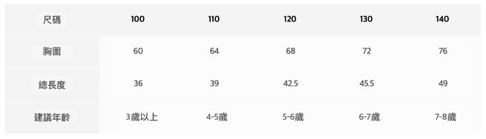 2. 平均尺寸表乃參考平均值制定,每位孩童成長速度略有不同,請參考孩子實際體型、現有衣物尺寸等實際測量結果進行選購。