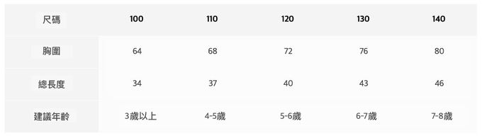 2. 平均尺寸表乃參考平均值制定,每位孩童成長速度略有不同,請參考孩子實際體型、現有衣物尺寸等實際測量結果進行選購。