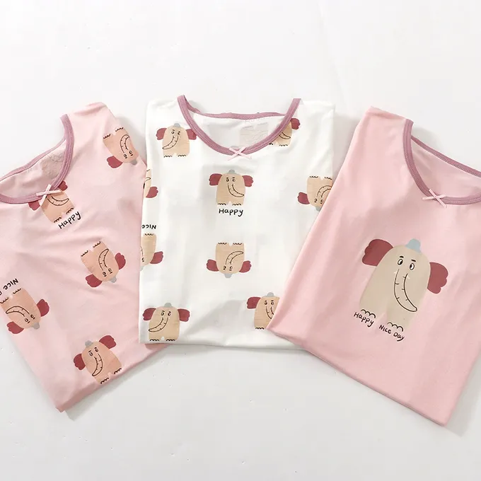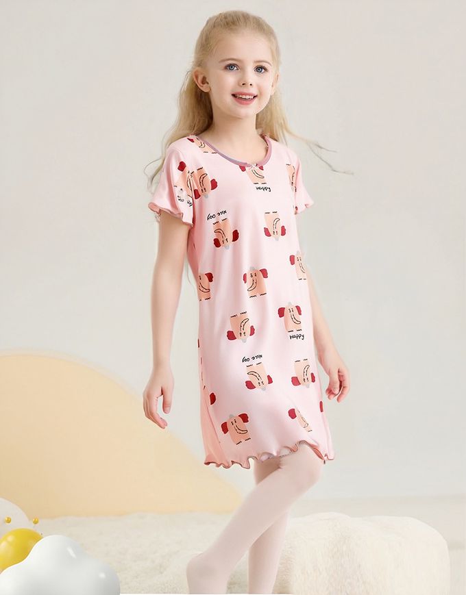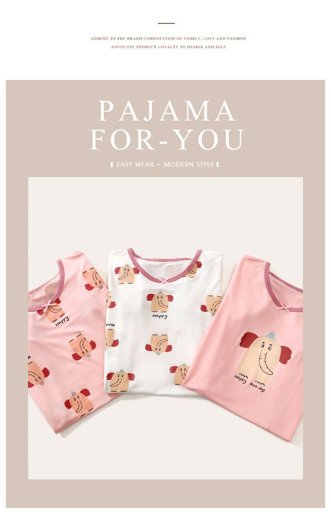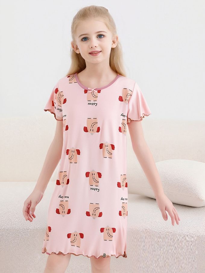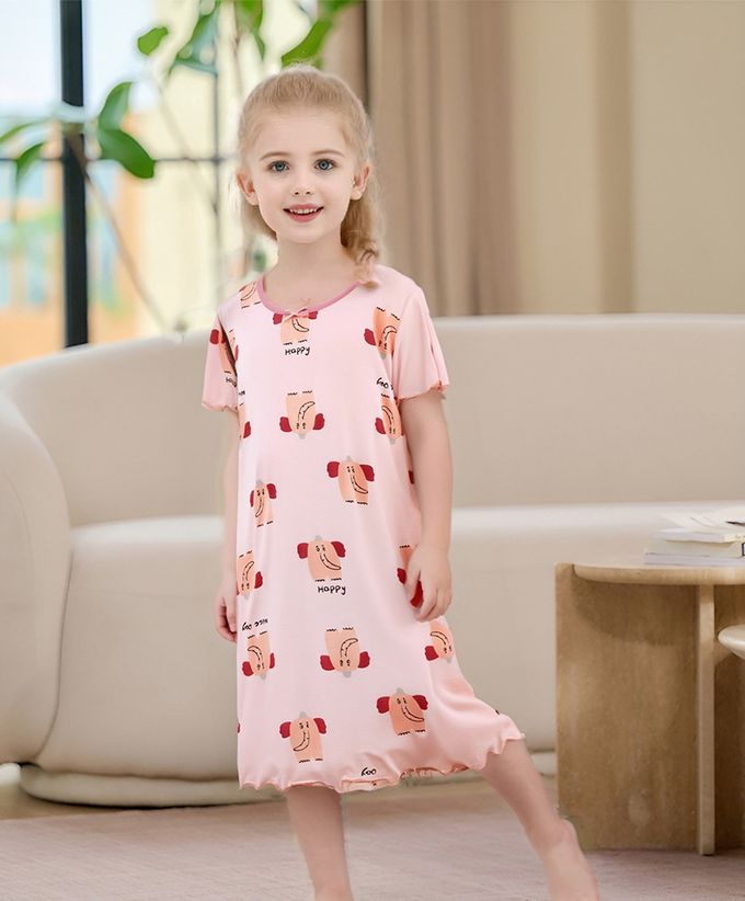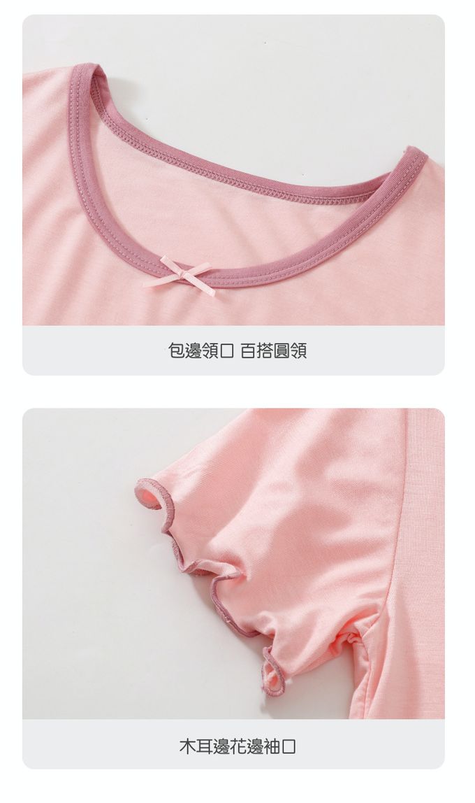 涼感莫代爾短袖連身睡裙/家居服-木耳邊大象-粉色