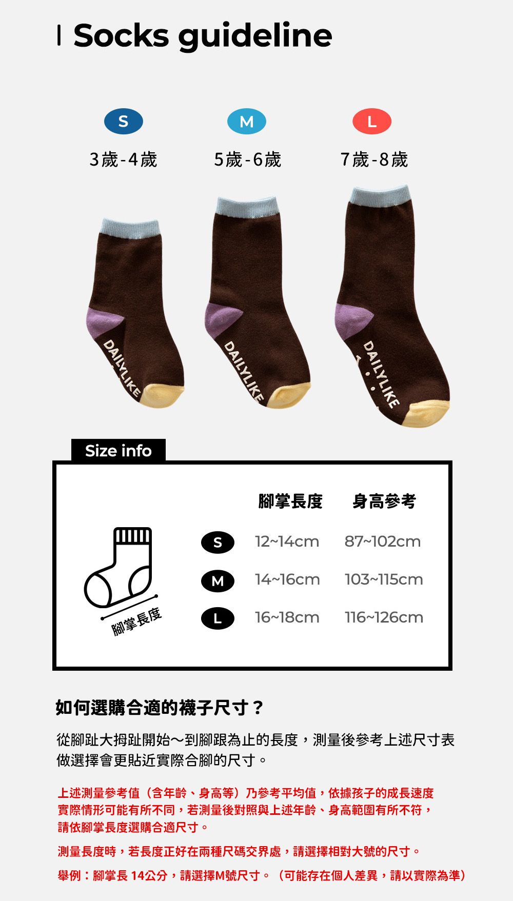 各種襪子的大約長度如下,上排有左至右:隱形襪/船型襪、短襪、短筒襪;下排由左至右:中筒襪、長筒襪。